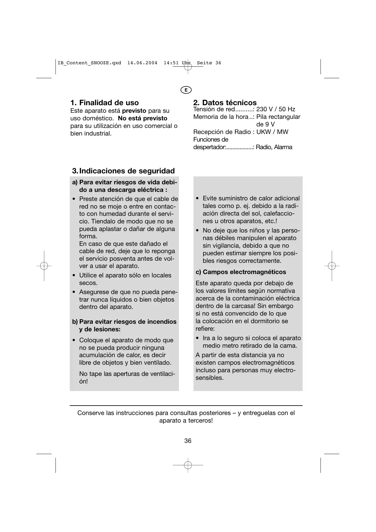 Tensión de red..........: 230 V / 50 Hz Memoria de la hora ..: Pila rectangular de 9 V Recepción de Radio : UKW / MW Funciones de despertador:..................: Radio, Alarma Este aparato está previsto para su uso doméstico. No está previsto para su utilización en uso comercial o bien industrial.