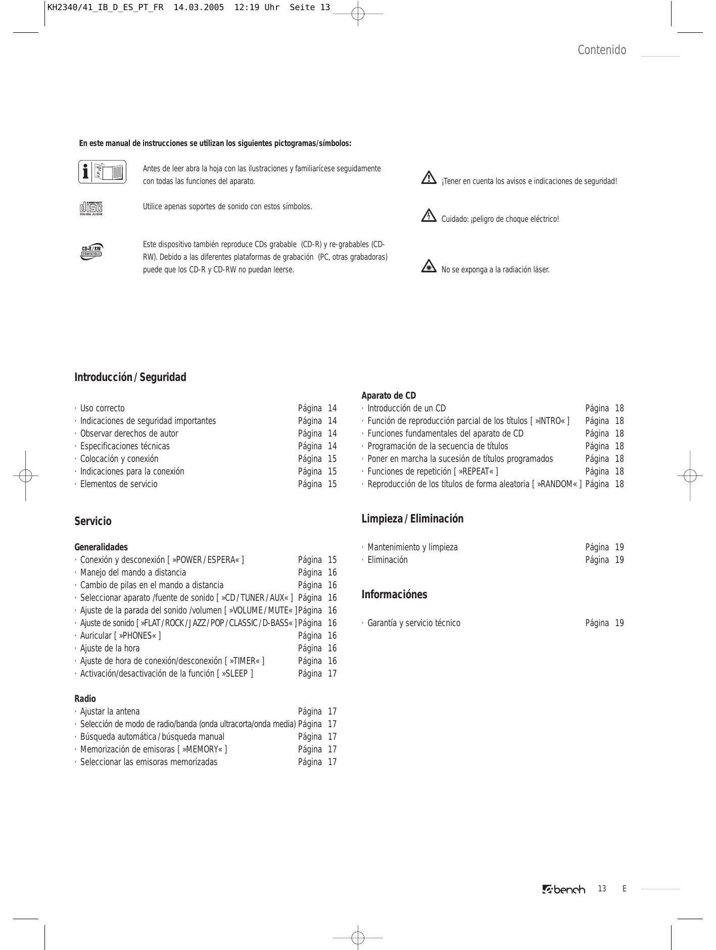 Equipo Mini-Design con reproductor de CD KH 2340 / 2341 Uso correcto El aparato ha sido diseñado para la reproducción de soportes de sonido (CD, CD-R, CD-RW) y para recibir emisoras de radio. Cualquier modificación del aparato se considerará como no válida y alberga peligros de accidente mayores. Los daños causados por una utilización incorrecta no conllevan ninguna responsabilidad para el fabricante. No es adecuado para el empleo industrial.