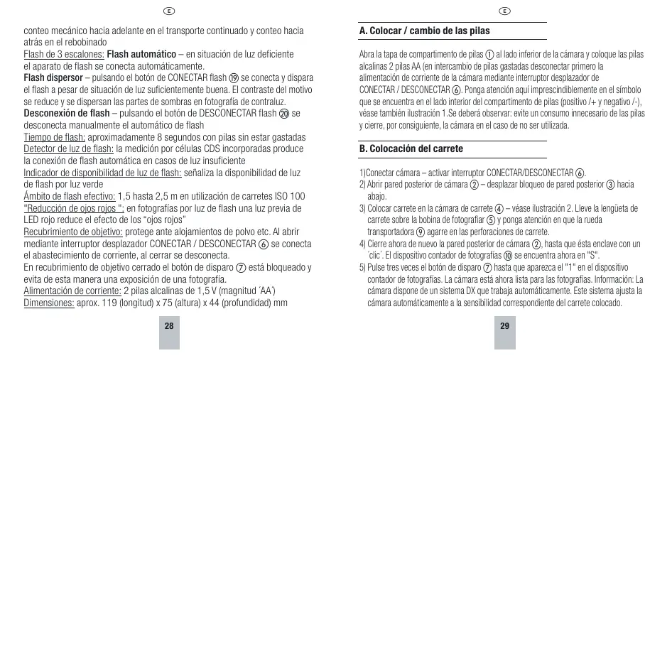 Desconecte en general siempre la alimentacion de corriente (desconectar interruptor desplazador CONECTAR / DESCONNECTAR 6) cuando usted no utilise laamera. Esto ahorraras pilas y protegera el objetivo ante socuedades. Si no DEA hacer fotografias por un长大o tiempo, saque las pilas. Proteja laamera ante Iluvia, humedaz, altas temperatas e irradiacion directa del sol (no guardar nunca laamera y los carretes en el auto). Para limiar el objetivo lo pueda hacer con cuidado con un trapo limpio y libre de pelusa.