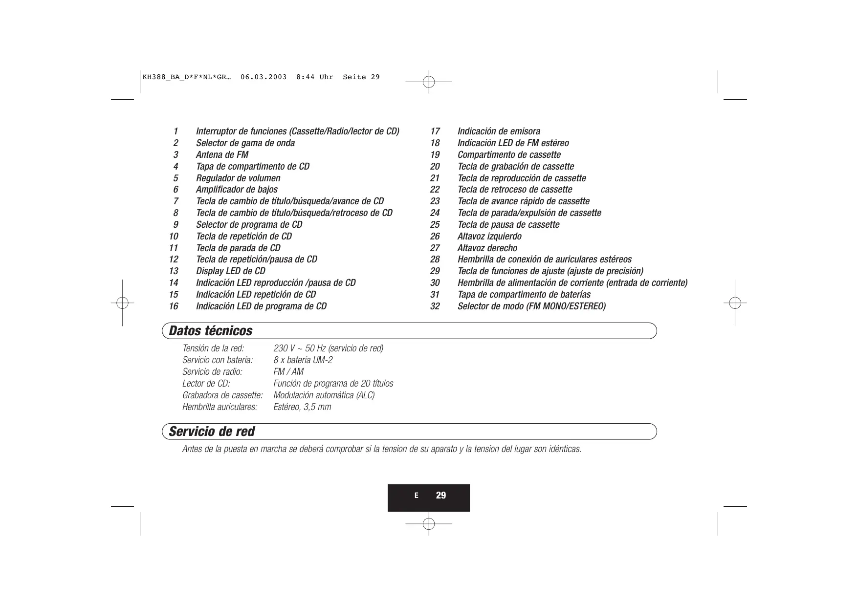 Tensión de la red: Servicio con batería: Servicio de radio: Lector de CD: Grabadora de cassette: Hembrilla auriculares: