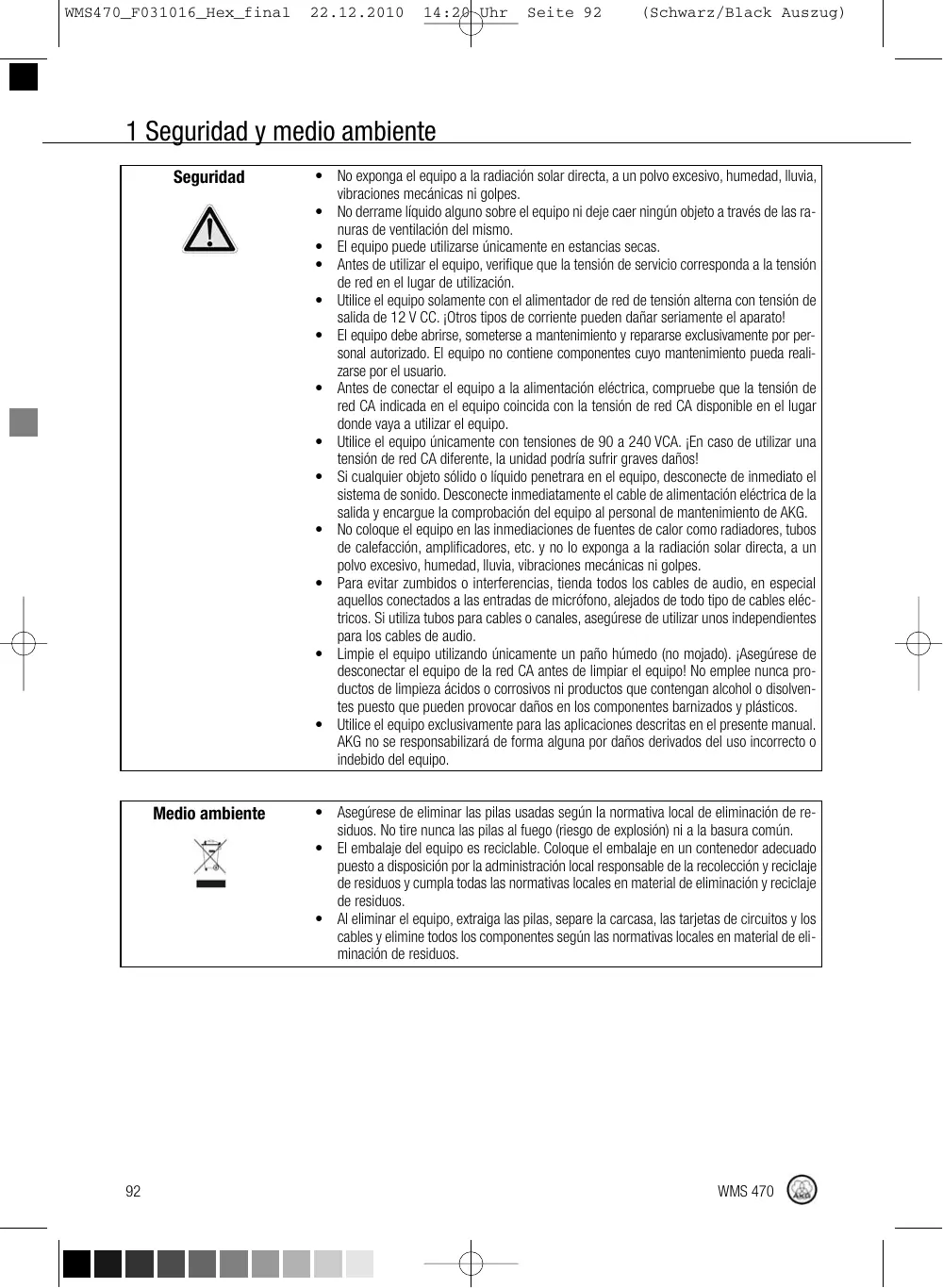 • No derrame líquido alguno sobre el equipo ni deje caer ningún objeto a través de las ranuras de ventilación del mismo. • El equipo puede utilizarse únicamente en estancias secas. • Antes de utilizar el equipo, verifique que la tensión de servicio corresponda a la tensión de red en el lugar de utilización. • Utilice el equipo solamente con el alimentador de red de tensión alterna con tensión de salida de 12 V CC. ¡Otros tipos de corriente pueden dañar seriamente el aparato! • El equipo debe abrirse, someterse a mantenimiento y repararse exclusivamente por personal autorizado. El equipo no contiene componentes cuyo mantenimiento pueda realizarse por el usuario. • Antes de conectar el equipo a la alimentación eléctrica, compruebe que la tensión de red CA indicada en el equipo coincida con la tensión de red CA disponible en el lugar donde vaya a utilizar el equipo. • Utilice el equipo únicamente con tensiones de 90 a 240 VCA. ¡En caso de utilizar una tensión de red CA diferente, la unidad podría sufrir graves daños! • Si cualquier objeto sólido o líquido penetrara en el equipo, desconecte de inmediato el sistema de sonido. Desconecte inmediatamente el cable de alimentación eléctrica de la salida y encargue la comprobación del equipo al personal de mantenimiento de AKG. • No coloque el equipo en las inmediaciones de fuentes de calor como radiadores, tubos de calefacción, amplificadores, etc. y no lo exponga a la radiación solar directa, a un polvo excesivo, humedad, lluvia, vibraciones mecánicas ni golpes. • Para evitar zumbidos o interferencias, tienda todos los cables de audio, en especial aquellos conectados a las entradas de micrófono, alejados de todo tipo de cables eléctricos. Si utiliza tubos para cables o canales, asegúrese de utilizar unos independientes para los cables de audio. • Limpie el equipo utilizando únicamente un paño húmedo (no mojado). ¡Asegúrese de desconectar el equipo de la red CA antes de limpiar el equipo! No emplee nunca productos de limpieza ácidos o corrosivos ni productos que contengan alcohol o disolventes puesto que pueden provocar daños en los componentes barnizados y plásticos. • Utilice el equipo exclusivamente para las aplicaciones descritas en el presente manual. AKG no se responsabilizará de forma alguna por daños derivados del uso incorrecto o indebido del equipo.