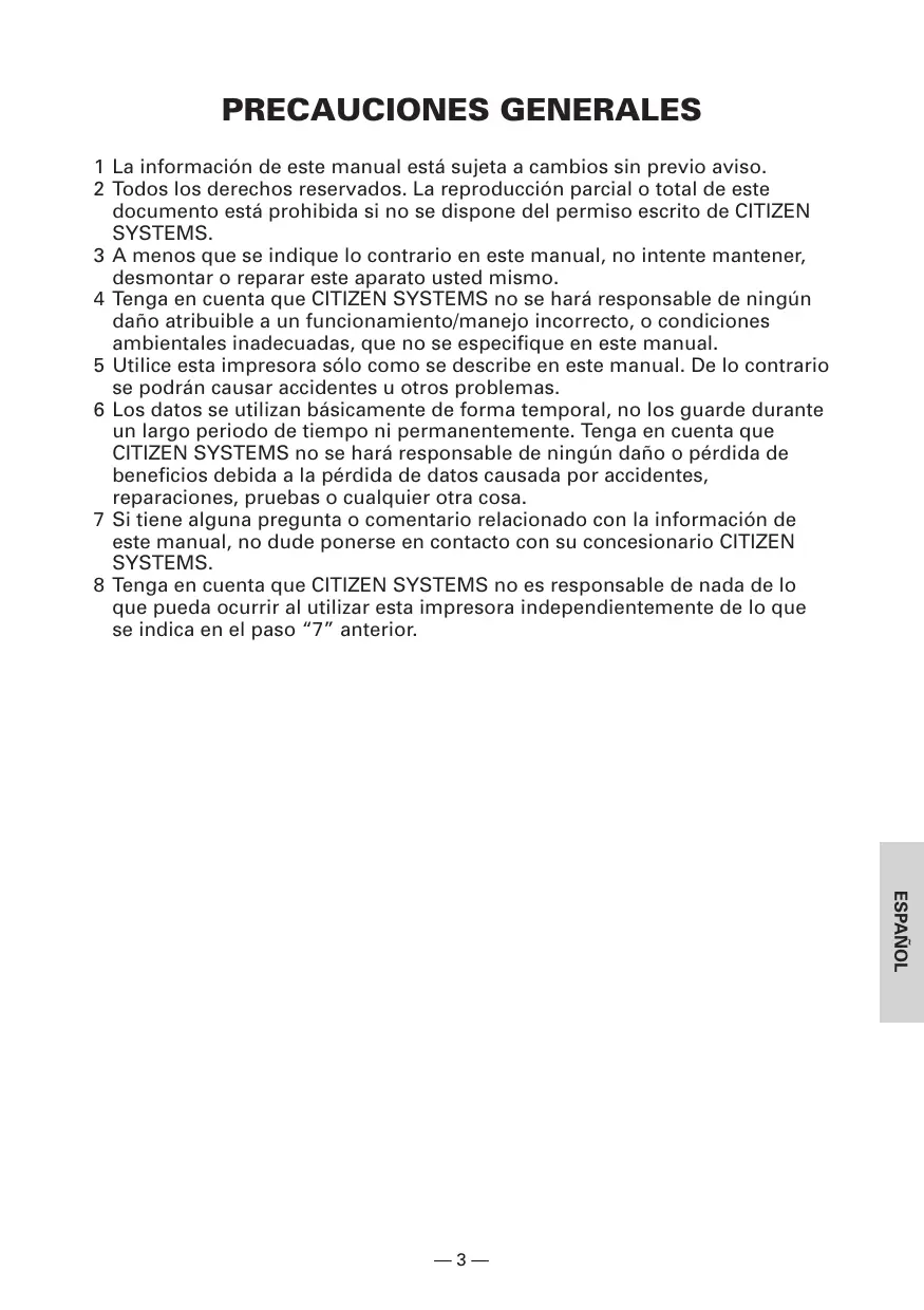 PRECAUCIONES GENERALES 1 La informaciôn de este manual estä sujeta a cambios sin previo aviso. 2 Todos los derechos reservados. La reproduccién parcial o total de este documento est4 prohibida si no se dispone del permiso escrito de CITIZEN SYSTEMS. 3 À menos que se indique lo contrario en este manual, no intente mantener, desmontar o reparar este aparato usted mismo. 4 Tenga en cuenta que CITIZEN SYSTEMS no se har responsable de ningün daño atribuible a un funcionamiento/manejo incorrecto, o condiciones ambientales inadecuadas, que no se especifique en este manual. 5 Utilice esta impresora sélo como se describe en este manual. De lo contrario se podrän causar accidentes u otros problemas. 6 Los datos se utilizan bâsicamente de forma temporal, no los guarde durante un largo periodo de tiempo ni permanentemente. Tenga en cuenta que CITIZEN SYSTEMS no se harä responsable de ningün daño o pérdida de beneficios debida a la pérdida de datos causada por accidentes, reparaciones, pruebas o cualquier otra cosa. 7 Sitiene alguna pregunta o comentario relacionado con la informacién de este manual, no dude ponerse en contacto con su concesionario CITIZEN SYSTEMS. 8 Tenga en cuenta que CITIZEN SYSTEMS no es responsable de nada de lo que pueda ocurrir al utilizar esta impresora independientemente de lo que se indica en el paso “7” anterior. 1ONVAS3