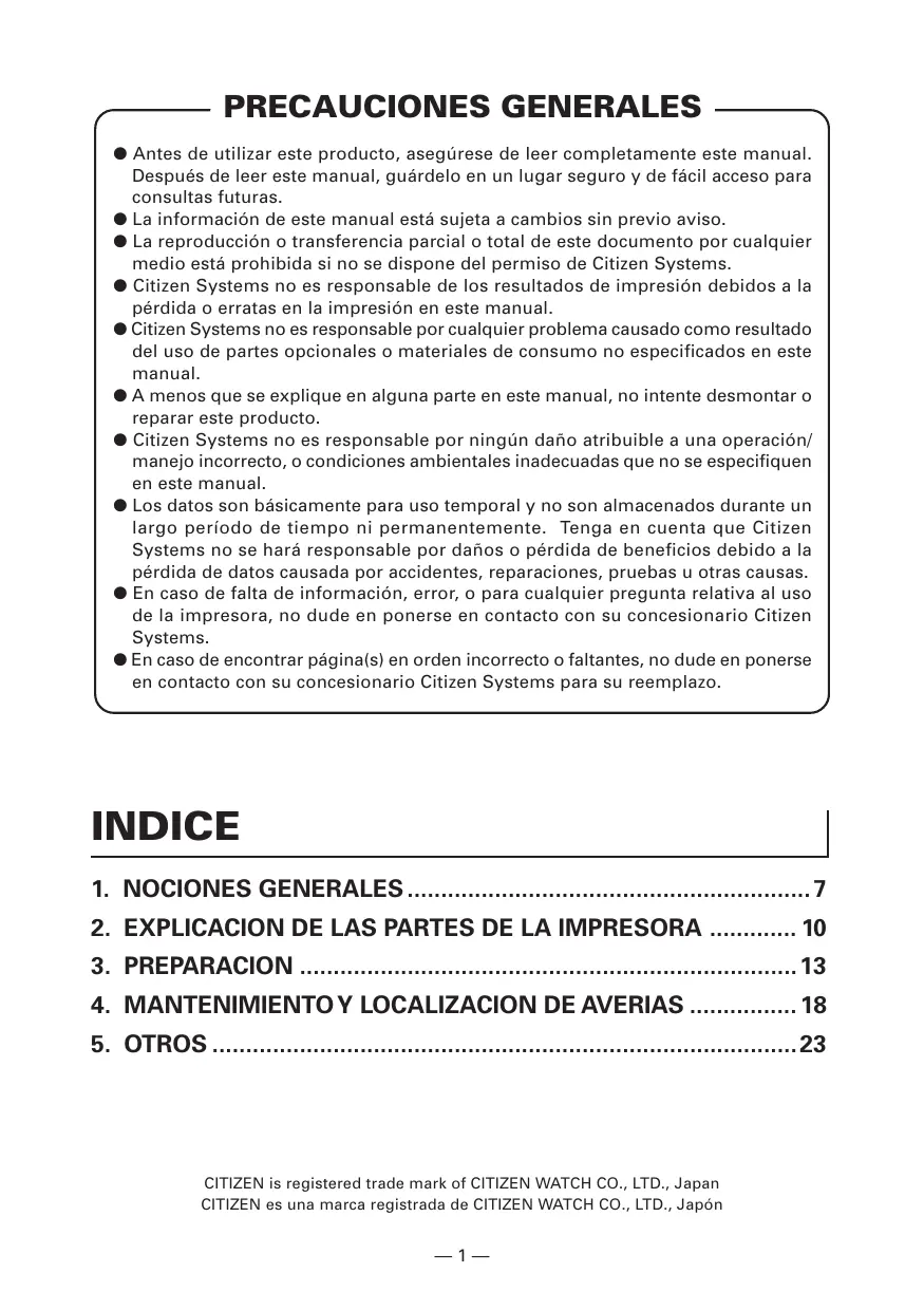 —— PRECAUCIONES GENERALES —— @ Antes de utilizar este producto, asegürese de leer completamente este manual. Después de leer este manual, gurdelo en un lugar seguro y de fâcil acceso para consultas futuras. © La informaciôn de este manual esté sujeta a cambios sin previo aviso. © La reproducciôn o transferencia parcial o total de este documento por cualquier medio esté prohibida si no se dispone del permiso de Citizen Systems. © Citizen Systems no es responsable de los resultados de impresién debidos a la pérdida o erratas en la impresiôn en este manual. @ Citizen Systems no es responsable por cualquier problema causado como resultado del uso de partes opcionales o materiales de consumo no especificados en este manual. © A menos que se explique en alguna parte en este manual, no intente desmontar o reparar este producto. @ Citizen Systems no es responsable por ningün daño atribuible a una operaciôn/ manejo incorrecto, o condiciones ambientales inadecuadas que no se especifiquen en este manual. © Los datos son bésicamente para uso temporal y no son almacenados durante un largo periodo de tiempo ni permanentemente. Tenga en cuenta que Citizen Systems no se har responsable por daños o pérdida de beneficios debido a la pérdida de datos causada por accidentes, reparaciones, pruebas u otras causas. @ En caso de falta de informaciôn, error, o para cualquier pregunta relativa al uso de la impresora, no dude en ponerse en contacto con su concesionario Citizen Systems. @ En caso de encontrar pâgina(s) en orden incorrecto o faltantes, no dude en ponerse en contacto con su concesionario Citizen Systems para su reemplazo. KL J INDICE NOCIONES GENERALES. EXPLICACION DE LAS PARTES DE LA IMPRESORA .. PREPARACION ..