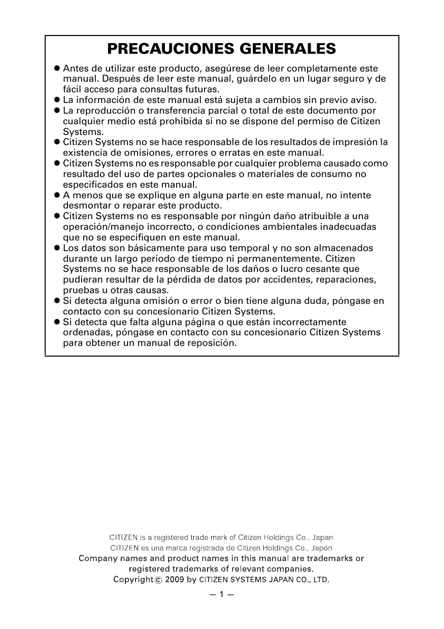 PRECAUCIONES GENERALES © Antes de utilizar este producto, asegürese de leer completamente este manual. Después de leer este manual, guärdelo en un lugar seguro y de fâcil acceso para consultas futuras. © La informaciôn de este manual estä sujeta a cambios sin previo aviso. © La reproducciôn o transferencia parcial o total de este documento por cualquier medio estä prohibida si no se dispone del permiso de Citizen Systems. Citizen Systems no se hace responsable de los resultados de impresiôn la existencia de omisiones, errores o erratas en este manual. e Citizen Systems no es responsable por cualquier problema causado como resultado del uso de partes opcionales o materiales de consumo no especificados en este manual. © À menos que se explique en alguna parte en este manual, no intente desmontar o reparar este producto. e Citizen Systems no es responsable por ningün daño atribuible a una operacién/manejo incorrecto, o condiciones ambientales inadecuadas que no se especifiquen en este manual. © Los datos son bâsicamente para uso temporal y no son almacenados durante un largo periodo de tiempo ni permanentemente. Citizen Systems no se hace responsable de los daños o lucro cesante que pudieran resultar de la pérdida de datos por accidentes, reparaciones, pruebas u otras causas. © Si detecta alguna omisiôn o error o bien tiene alguna duda, péngase en contacto con su concesionario Citizen Systems. e Si detecta que falta alguna pägina o que estän incorrectamente ordenadas, péngase en contacto con su concesionario Citizen Systems para obtener un manual de reposiciôn. CITIZEN is are ngs Co. J: CITIZEN es una marca registrada de Citizen Holdings Co., Japôn Company names and product names in this manual are trademarks or registered trademarks of relevant companies. Copyright© 2009 by CITIZEN SYSTEMS JAPAN CO. LTD.