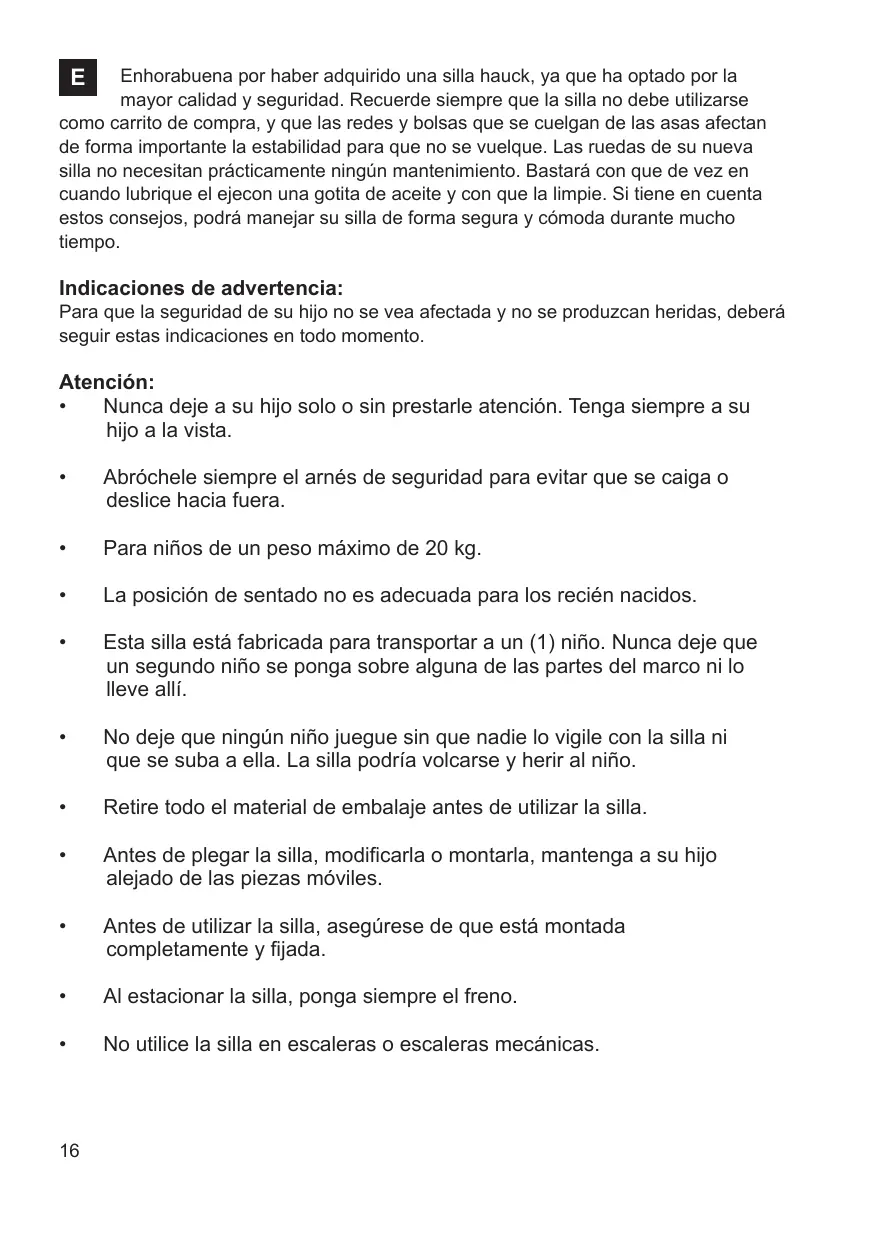 E Enhorabuena por haber adquirido una silla hauck, ya que ha optado por la mayor calidad y seguridad. Recuerde siempre que la silla no debe utilizarse como carrito de compra, y que las redes y bolsas que se cuelgan de las asas afectan de forma importante la estabilidad para que no se vuelque. Las ruedas de su nueva silla no necesitan prácticamente ningún mantenimiento. Bastará con que de vez en cuando lubrique el ejecon una gotita de aceite y con que la limpie. Si tiene en cuenta estos consejos, podrá manejar su silla de forma segura y cómoda durante mucho tiempo.