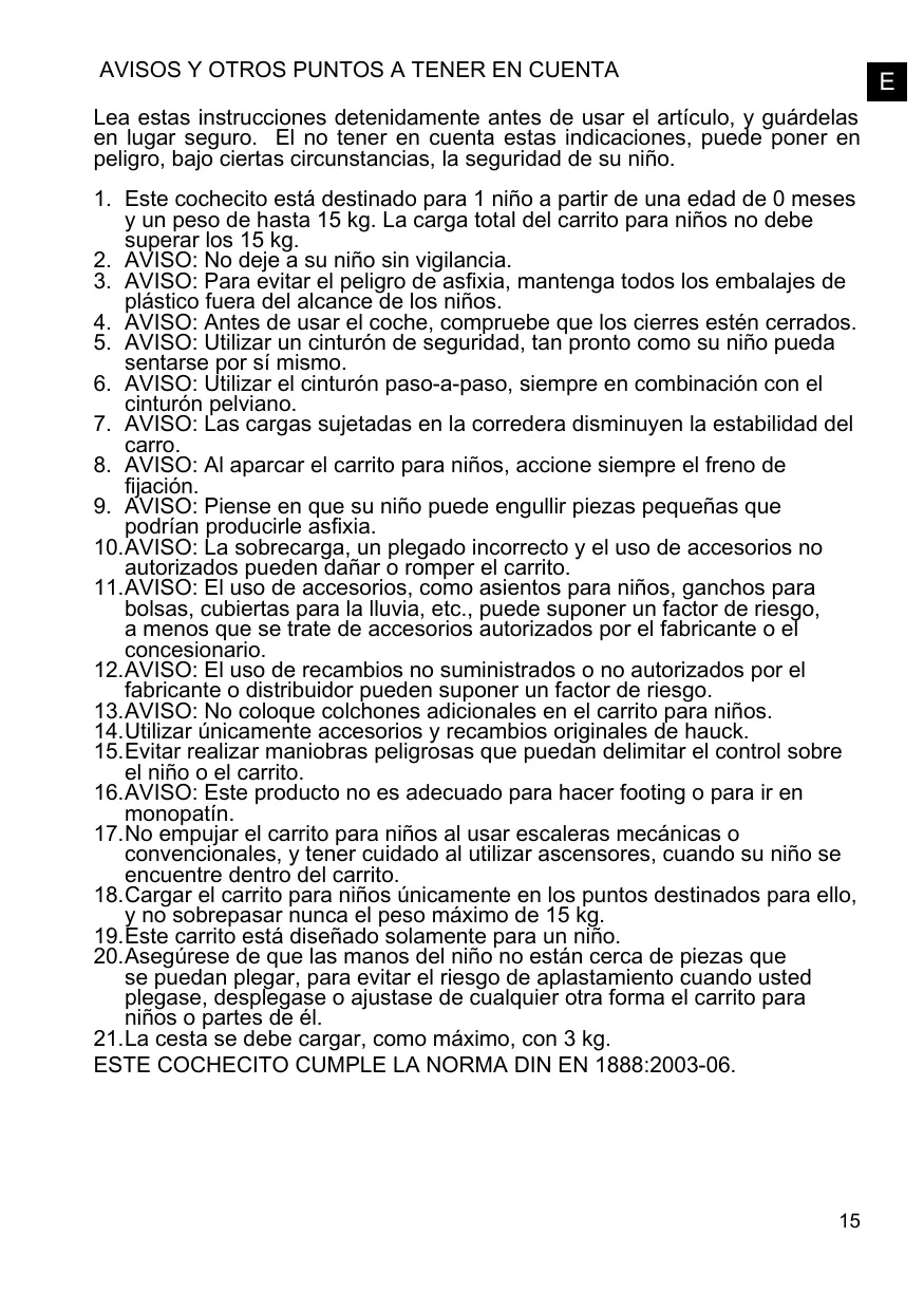 1. Este cochecito está destinado para 1 niño a partir de una edad de 0 meses y un peso de hasta 15 kg. La carga total del carrito para niños no debe superar los 15 kg. 2. AVISO: No deje a su niño sin vigilancia. 3. AVISO: Para evitar el peligro de asfixia, mantenga todos los embalajes de plástico fuera del alcance de los niños. 4. AVISO: Antes de usar el coche, compruebe que los cierres estén cerrados. 5. AVISO: Utilizar un cinturón de seguridad, tan pronto como su niño pueda sentarse por sí mismo. 6. AVISO: Utilizar el cinturón paso-a-paso, siempre en combinación con el cinturón pelviano. 7. AVISO: Las cargas sujetadas en la corredera disminuyen la estabilidad del carro. 8. AVISO: Al aparcar el carrito para niños, accione siempre el freno de fijación. 9. AVISO: Piense en que su niño puede engullir piezas pequeñas que podrían producirle asfixia. 10.AVISO: La sobrecarga, un plegado incorrecto y el uso de accesorios no autorizados pueden dañar o romper el carrito. 11.AVISO: El uso de accesorios, como asientos para niños, ganchos para bolsas, cubiertas para la lluvia, etc., puede suponer un factor de riesgo, a menos que se trate de accesorios autorizados por el fabricante o el concesionario. 12.AVISO: El uso de recambios no suministrados o no autorizados por el fabricante o distribuidor pueden suponer un factor de riesgo. 13.AVISO: No coloque colchones adicionales en el carrito para niños. 14.Utilizar únicamente accesorios y recambios originales de hauck. 15.Evitar realizar maniobras peligrosas que puedan delimitar el control sobre el niño o el carrito. 16.AVISO: Este producto no es adecuado para hacer footing o para ir en monopatín. 17.No empujar el carrito para niños al usar escaleras mecánicas o convencionales, y tener cuidado al utilizar ascensores, cuando su niño se encuentre dentro del carrito. 18.Cargar el carrito para niños únicamente en los puntos destinados para ello, y no sobrepasar nunca el peso máximo de 15 kg. 19.Este carrito está diseñado solamente para un niño. 20.Asegúrese de que las manos del niño no están cerca de piezas que se puedan plegar, para evitar el riesgo de aplastamiento cuando usted plegase, desplegase o ajustase de cualquier otra forma el carrito para niños o partes de él. 21.La cesta se debe cargar, como máximo, con 3 kg. ESTE COCHECITO CUMPLE LA NORMA DIN EN 1888:2003-06.