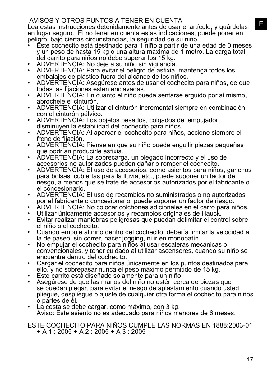 • Este cochecito está destinado para 1 niño a partir de una edad de 0 meses y un peso de hasta 15 kg o una altura máxima de 1 metro. La carga total del carrito para niños no debe superar los 15 kg. • ADVERTENCIA: No deje a su niño sin vigilancia. • ADVERTENCIA: Para evitar el peligro de asfixia, mantenga todos los embalajes de plástico fuera del alcance de los niños. • ADVERTENCIA: Asegúrese antes de usar el cochecito para niños, de que todas las fijaciones estén enclavadas. • ADVERTENCIA: En cuanto el niño pueda sentarse erguido por sí mismo, abróchele el cinturón. • ADVERTENCIA: Utilizar el cinturón incremental siempre en combinación con el cinturón pélvico. • ADVERTENCIA: Los objetos pesados, colgados del empujador, disminuyen la estabilidad del cochecito para niños. • ADVERTENCIA: Al aparcar el cochecito para niños, accione siempre el freno de fijación. • ADVERTENCIA: Piense en que su niño puede engullir piezas pequeñas que podrían producirle asfixia. • ADVERTENCIA: La sobrecarga, un plegado incorrecto y el uso de accesorios no autorizados pueden dañar o romper el cochecito. • ADVERTENCIA: El uso de accesorios, como asientos para niños, ganchos para bolsas, cubiertas para la lluvia, etc., puede suponer un factor de riesgo, a menos que se trate de accesorios autorizados por el fabricante o el concesionario. • ADVERTENCIA: El uso de recambios no suministrados o no autorizados por el fabricante o concesionario, puede suponer un factor de riesgo. • ADVERTENCIA: No colocar colchones adicionales en el carro para niños. • Utilizar únicamente accesorios y recambios originales de Hauck. • Evitar realizar maniobras peligrosas que puedan delimitar el control sobre el niño o el cochecito. • Cuando empuje al niño dentro del cochecito, debería limitar la velocidad a la de paseo, sin correr, hacer jogging, ni ir en monopatín. • No empujar el cochecito para niños al usar escaleras mecánicas o convencionales, y tener cuidado al utilizar ascensores, cuando su niño se encuentre dentro del cochecito. • Cargar el cochecito para niños únicamente en los puntos destinados para ello, y no sobrepasar nunca el peso máximo permitido de 15 kg. • Este carrito está diseñado solamente para un niño. • Asegúrese de que las manos del niño no estén cerca de piezas que se puedan plegar, para evitar el riesgo de aplastamiento cuando usted pliegue, despliegue o ajuste de cualquier otra forma el cochecito para niños o partes de él. • La cesta se debe cargar, como máximo, con 3 kg. Aviso: Este asiento no es adecuado para niños menores de 6 meses. ESTE COCHECITO PARA NIÑOS CUMPLE LAS NORMAS EN 1888:2003-01 + A 1 : 2005 + A 2 : 2005 + A 3 : 2005