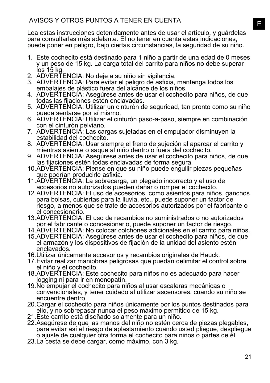 AVISOS Y OTROS PUNTOS A TENER EN CUENTA Lea estas instrucciones detenidamente antes de usar el artículo, y guárdelas para consultarlas más adelante. El no tener en cuenta estas indicaciones, puede poner en peligro, bajo ciertas circunstancias, la seguridad de su niño. 1. Este cochecito está destinado para 1 niño a partir de una edad de 0 meses y un peso de 15 kg. La carga total del carrito para niños no debe superar los 15 kg. 2. ADVERTENCIA: No deje a su niño sin vigilancia. 3. ADVERTENCIA: Para evitar el peligro de asfixia, mantenga todos los embalajes de plástico fuera del alcance de los niños. 4. ADVERTENCIA: Asegúrese antes de usar el cochecito para niños, de que todas las fijaciones estén enclavadas. 5. ADVERTENCIA: Utilizar un cinturón de seguridad, tan pronto como su niño pueda sentarse por sí mismo. 6. ADVERTENCIA: Utilizar el cinturón paso-a-paso, siempre en combinación con el cinturón pelviano. 7. ADVERTENCIA: Las cargas sujetadas en el empujador disminuyen la estabilidad del cochecito. 8. ADVERTENCIA: Usar siempre el freno de sujeción al aparcar el carrito y mientras asiente o saque al niño dentro o fuera del cochecito. 9. ADVERTENCIA: Asegúrese antes de usar el cochecito para niños, de que las fijaciones estén todas enclavadas de forma segura. 10.ADVERTENCIA: Piense en que su niño puede engullir piezas pequeñas que podrían producirle asfixia. 11.ADVERTENCIA: La sobrecarga, un plegado incorrecto y el uso de accesorios no autorizados pueden dañar o romper el cochecito. 12.ADVERTENCIA: El uso de accesorios, como asientos para niños, ganchos para bolsas, cubiertas para la lluvia, etc., puede suponer un factor de riesgo, a menos que se trate de accesorios autorizados por el fabricante o el concesionario. 13.ADVERTENCIA: El uso de recambios no suministrados o no autorizados por el fabricante o concesionario, puede suponer un factor de riesgo. 14.ADVERTENCIA: No colocar colchones adicionales en el carrito para niños. 15.ADVERTENCIA: Asegúrese antes de usar el cochecito para niños, de que el armazón y los dispositivos de fijación de la unidad del asiento estén enclavados. 16.Utilizar únicamente accesorios y recambios originales de Hauck. 17.Evitar realizar maniobras peligrosas que puedan delimitar el control sobre el niño y el cochecito. 18.ADVERTENCIA: Este cochecito para niños no es adecuado para hacer jogging ni para ir en monopatín. 19.No empujar el cochecito para niños al usar escaleras mecánicas o convencionales, y tener cuidado al utilizar ascensores, cuando su niño se encuentre dentro. 20.Cargar el cochecito para niños únicamente por los puntos destinados para ello, y no sobrepasar nunca el peso máximo permitido de 15 kg. 21.Este carrito está diseñado solamente para un niño. 22.Asegúrese de que las manos del niño no estén cerca de piezas plegables, para evitar así el riesgo de aplastamiento cuando usted pliegue, despliegue o ajuste de cualquier otra forma el cochecito para niños o partes de él. 23.La cesta se debe cargar, como máximo, con 3 kg. 21