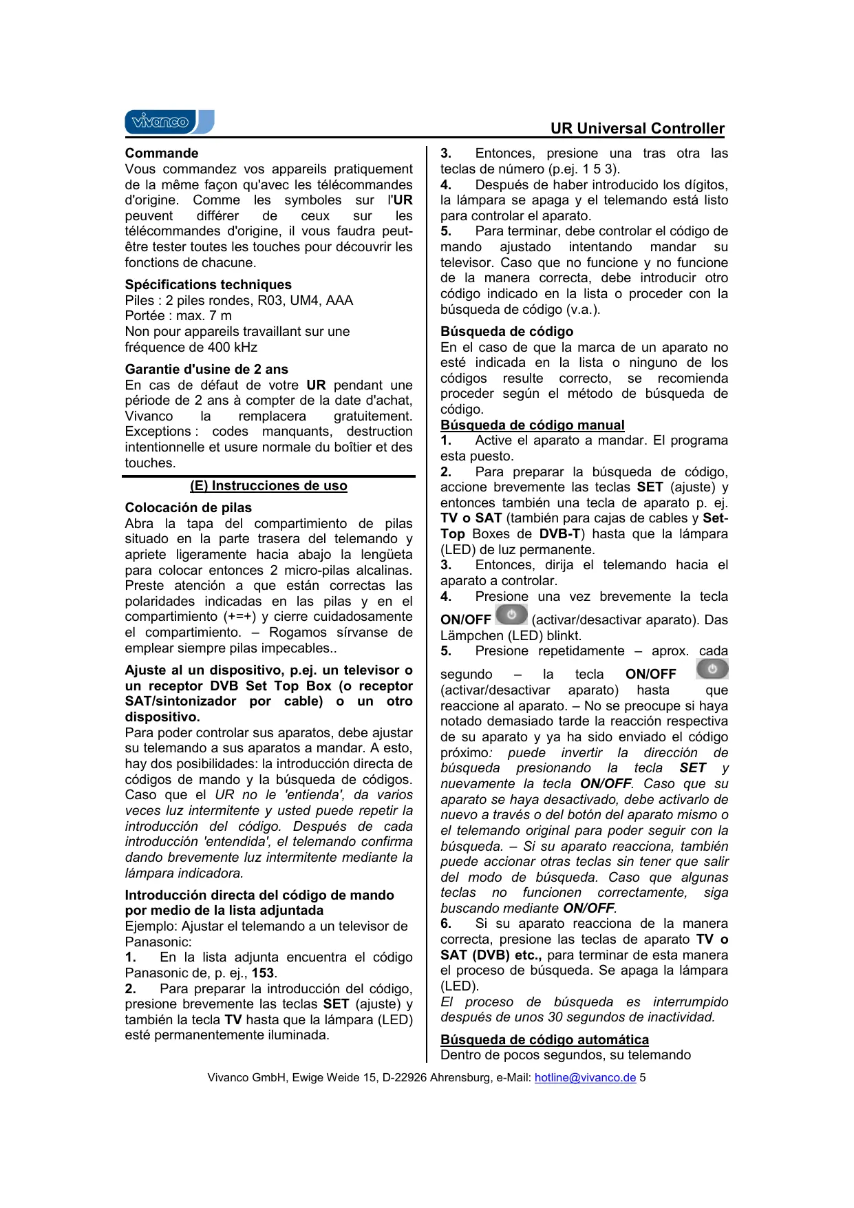 Vivanco la remplacera gratuitement. Exceptions : codes manquants, destruction intentionnelle et usure normale du boîtier et des touches. (E) Instrucciones de uso Colocación de pilas Abra la tapa del compartimiento de pilas situado en la parte trasera del telemando y apriete ligeramente hacia abajo la lengüeta para colocar entonces 2 micro-pilas alcalinas. Preste atención a que están correctas las polaridades indicadas en las pilas y en el compartimiento (+=+) y cierre cuidadosamente el compartimiento. – Rogamos sírvanse de emplear siempre pilas impecables.. Ajuste al un dispositivo, p.ej. un televisor o un receptor DVB Set Top Box (o receptor SAT/sintonizador por cable) o un otro dispositivo. Para poder controlar sus aparatos, debe ajustar su telemando a sus aparatos a mandar. A esto, hay dos posibilidades: la introducción directa de códigos de mando y la búsqueda de códigos. Caso que el UR no le 'entienda', da varios veces luz intermitente y usted puede repetir la introducción del código. Después de cada introducción 'entendida', el telemando confirma dando brevemente luz intermitente mediante la lámpara indicadora. Introducción directa del código de mando por medio de la lista adjuntada Ejemplo: Ajustar el telemando a un televisor de Panasonic: 1. En la lista adjunta encuentra el código Panasonic de, p. ej., 153. En el caso de que la marca de un aparato no esté indicada en la lista o ninguno de los códigos resulte correcto, se recomienda proceder según el método de búsqueda de código. Búsqueda de código manual 1. Active el aparato a mandar. El programa esta puesto. 2.