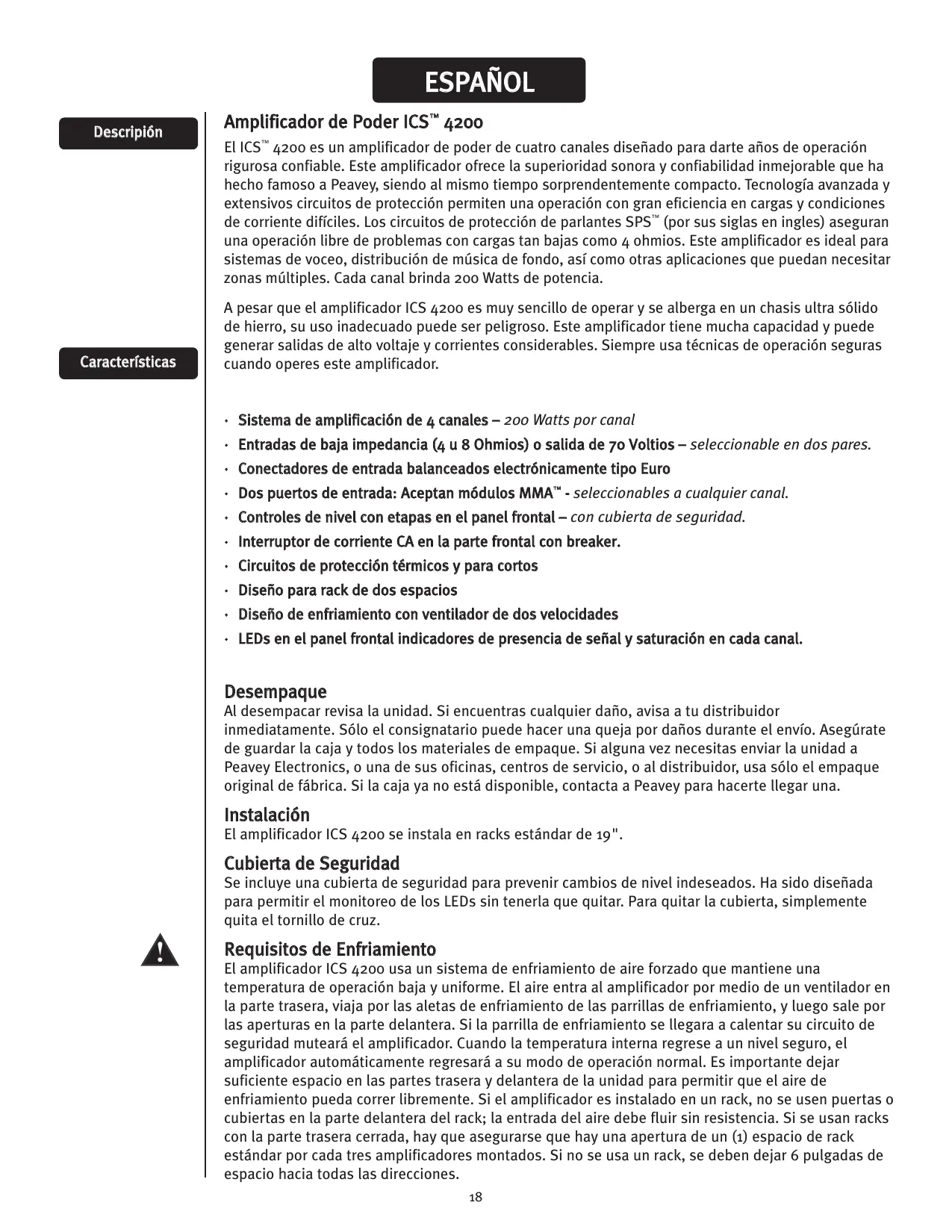 Amplificador de Poder ICS™ 4200 El ICS™ 4200 es un amplificador de poder de cuatro canales diseñado para darte años de operación rigurosa confiable. Este amplificador ofrece la superioridad sonora y confiabilidad inmejorable que ha hecho famoso a Peavey, siendo al mismo tiempo sorprendentemente compacto. Tecnología avanzada y extensivos circuitos de protección permiten una operación con gran eficiencia en cargas y condiciones de corriente difíciles. Los circuitos de protección de parlantes SPS™ (por sus siglas en ingles) aseguran una operación libre de problemas con cargas tan bajas como 4 ohmios. Este amplificador es ideal para sistemas de voceo, distribución de música de fondo, así como otras aplicaciones que puedan necesitar zonas múltiples. Cada canal brinda 200 Watts de potencia. A pesar que el amplificador ICS 4200 es muy sencillo de operar y se alberga en un chasis ultra sólido de hierro, su uso inadecuado puede ser peligroso. Este amplificador tiene mucha capacidad y puede generar salidas de alto voltaje y corrientes considerables. Siempre usa técnicas de operación seguras cuando operes este amplificador.