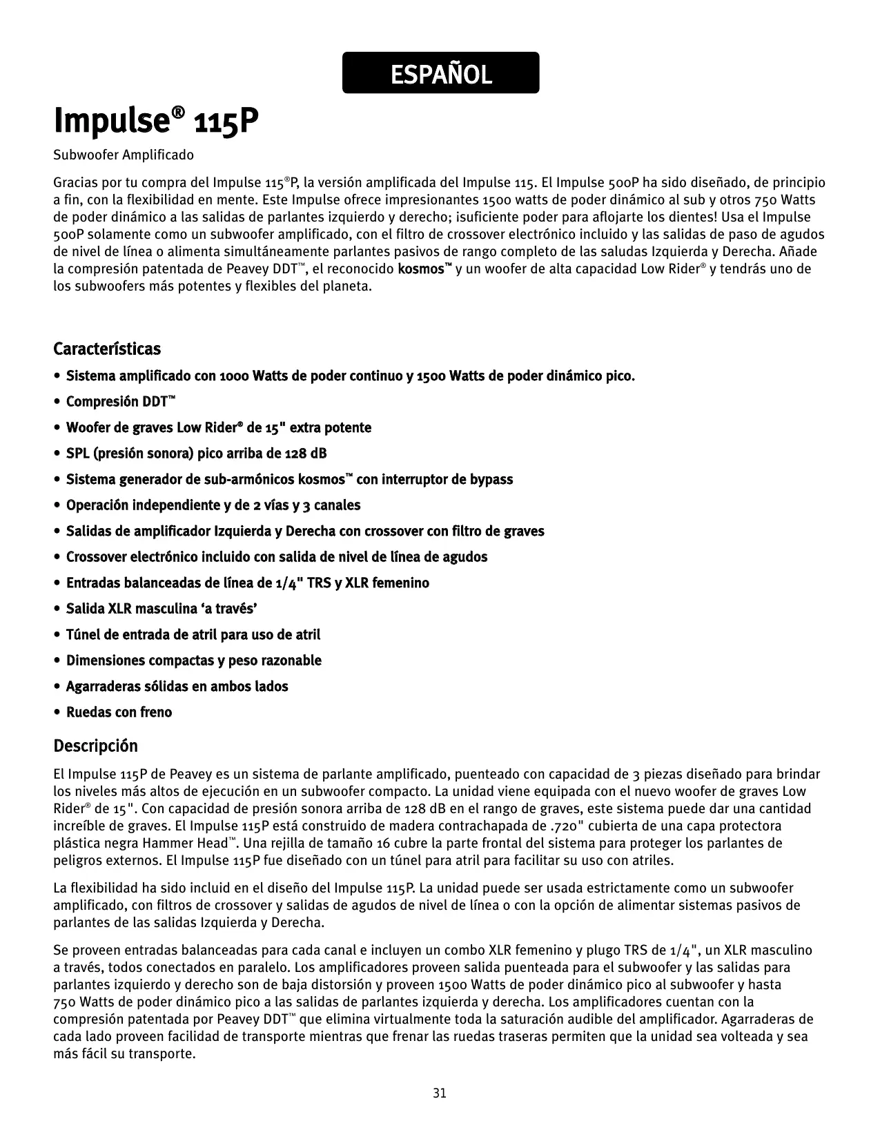 DDT Dynamic Range: Greater than 18 dB THD & IM: Typically less than 0.3% Damping Factor: Typically less than 100 @ 1000 Hz‚ 8 Ohms Power Requirements: 1300 W‚ 120 VAC‚ 60 Hz ESPAÑOL Impulse® 115P Subwoofer Amplificado Gracias por tu compra del Impulse 115®P, la versión amplificada del Impulse 115. El Impulse 500P ha sido diseñado, de principio a fin, con la flexibilidad en mente. Este Impulse ofrece impresionantes 1500 watts de poder dinámico al sub y otros 750 Watts de poder dinámico a las salidas de parlantes izquierdo y derecho; ¡suficiente poder para aflojarte los dientes! Usa el Impulse 500P solamente como un subwoofer amplificado, con el filtro de crossover electrónico incluido y las salidas de paso de agudos de nivel de línea o alimenta simultáneamente parlantes pasivos de rango completo de las saludas Izquierda y Derecha. Añade la compresión patentada de Peavey DDT™, el reconocido kosmos™ y un woofer de alta capacidad Low Rider® y tendrás uno de los subwoofers más potentes y flexibles del planeta. Características