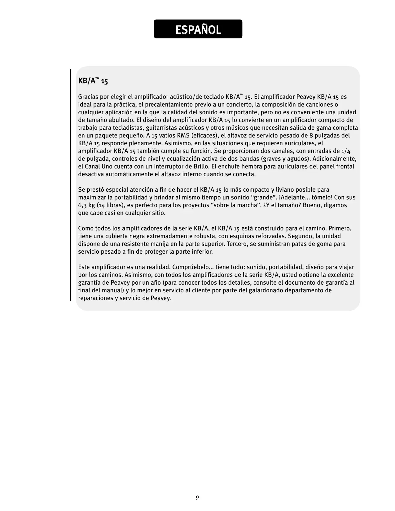 Dieses Symbol soll den Benutzer auf wichtige Instruktionen in der Bedienungsanleitung aufmerksam machen, die Handhabung und Wartung des Produkts betreffen. égalisation active à deux bandes (hautes et basses fréquences). Le canal One (Un) offre de surcroît un commutateur de Bright. Le jack pour casque d’écoute du panneau avant désactive automatiquement le haut-parleur interne lorsqu’un casque y est branché. De grands efforts ont été faits pour rendre le KB/A 15 aussi compact et léger que possible afin de faciliter son transport sans pour autant sacrifier la puissance du son. Allez-y, soulevez-le ! Avec ses 7 kilos, il est parfait pour les tournées. Sa taille? Disons qu’il se glisse partout. Comme tous les amplis de la Série KB/A, le KB/A est construit pour tenir la route : preuve en est son habillage en tissu noir très résistant avec coins renforcés, sa poignée robuste sur le dessus, et ses pieds en caoutchouc résistant, qui protègent le fond du coffret. Non, vous ne rêvez pas, cet ampli offre vraiment tout ce dont vous avez besoin: qualité et puissance du son, facilité de transport et conception adaptée aux tournées. De surcroît, comme pour tous les amplis de la série KB/A, vous bénéficierez de l’excellente garantie d’un an de Peavey (pour de plus amples détails, consultez le formulaire de garantie à la fin du manuel), et d’une exceptionnelle assistance à la clientèle par le service de réparations et maintenance de Peavey.