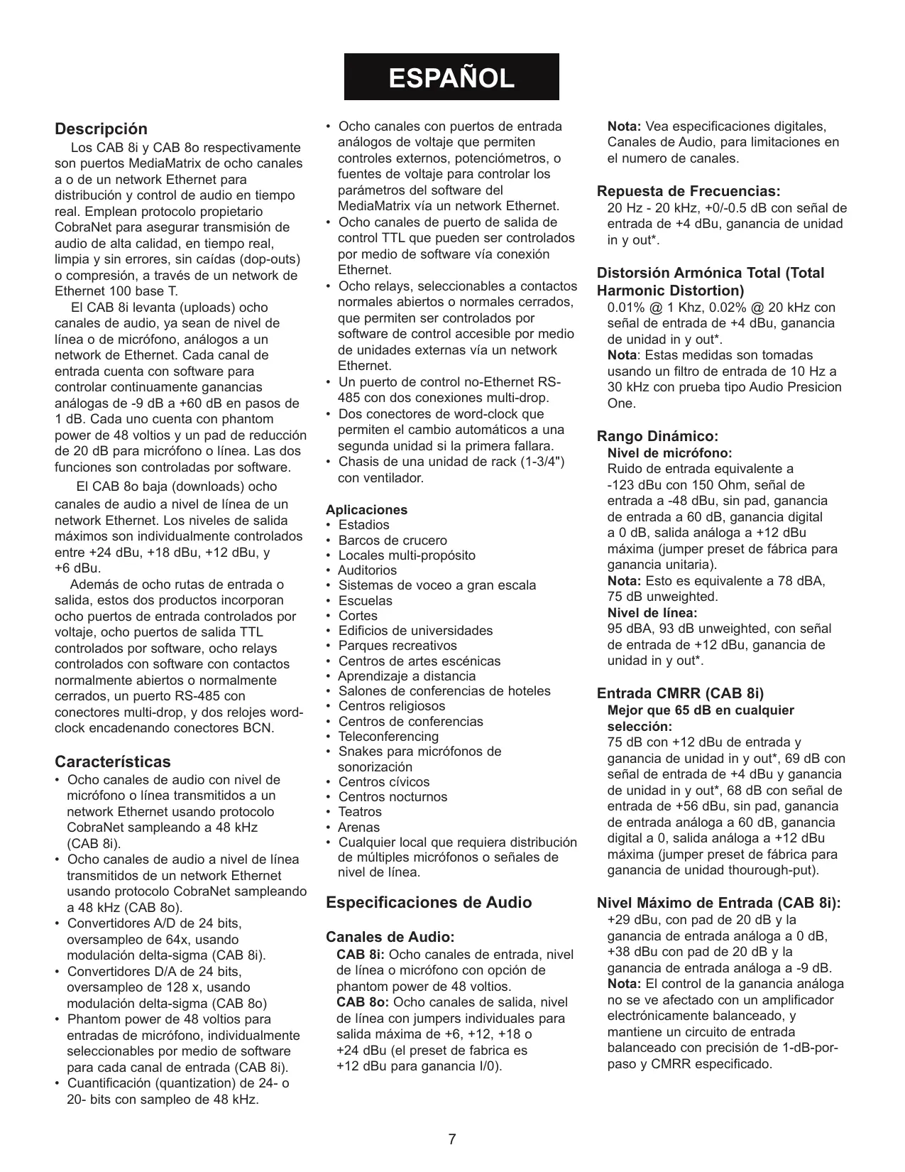ESPA„OL Descripci—n Los CAB 8i y CAB 8o respectivamente son puertos MediaMatrix de ocho canales a o de un network Ethernet para distribuci—n y control de audio en tiempo real. Emplean protocolo propietario CobraNet para asegurar transmisi—n de audio de alta calidad, en tiempo real, limpia y sin errores, sin ca’das (dop-outs) o compresi—n, a travŽs de un network de Ethernet 100 base T. El CAB 8i levanta (uploads) ocho canales de audio, ya sean de nivel de l’nea o de micr—fono, an‡logos a un network de Ethernet. Cada canal de entrada cuenta con software para controlar continuamente ganancias an‡logas de -9 dB a +60 dB en pasos de 1 dB. Cada uno cuenta con phantom power de 48 voltios y un pad de reducci—n de 20 dB para micr—fono o l’nea. Las dos funciones son controladas por software. El CAB 8o baja (downloads) ocho canales de audio a nivel de l’nea de un network Ethernet. Los niveles de salida m‡ximos son individualmente controlados entre +24 dBu, +18 dBu, +12 dBu, y +6 dBu. Adem‡s de ocho rutas de entrada o salida, estos dos productos incorporan ocho puertos de entrada controlados por voltaje, ocho puertos de salida TTL controlados por software, ocho relays controlados con software con contactos normalmente abiertos o normalmente cerrados, un puerto RS-485 con conectores multi-drop, y dos relojes wordclock encadenando conectores BCN. Caracter’sticas ¥ Ocho canales de audio con nivel de micr—fono o l’nea transmitidos a un network Ethernet usando protocolo CobraNet sampleando a 48 kHz (CAB 8i). ¥ Ocho canales de audio a nivel de l’nea transmitidos de un network Ethernet usando protocolo CobraNet sampleando a 48 kHz (CAB 8o). ¥ Convertidores A/D de 24 bits, oversampleo de 64x, usando modulaci—n delta-sigma (CAB 8i). ¥ Convertidores D/A de 24 bits, oversampleo de 128 x, usando modulaci—n delta-sigma (CAB 8o) ¥ Phantom power de 48 voltios para entradas de micr—fono, individualmente seleccionables por medio de software para cada canal de entrada (CAB 8i). ¥ Cuantificaci—n (quantization) de 24- o