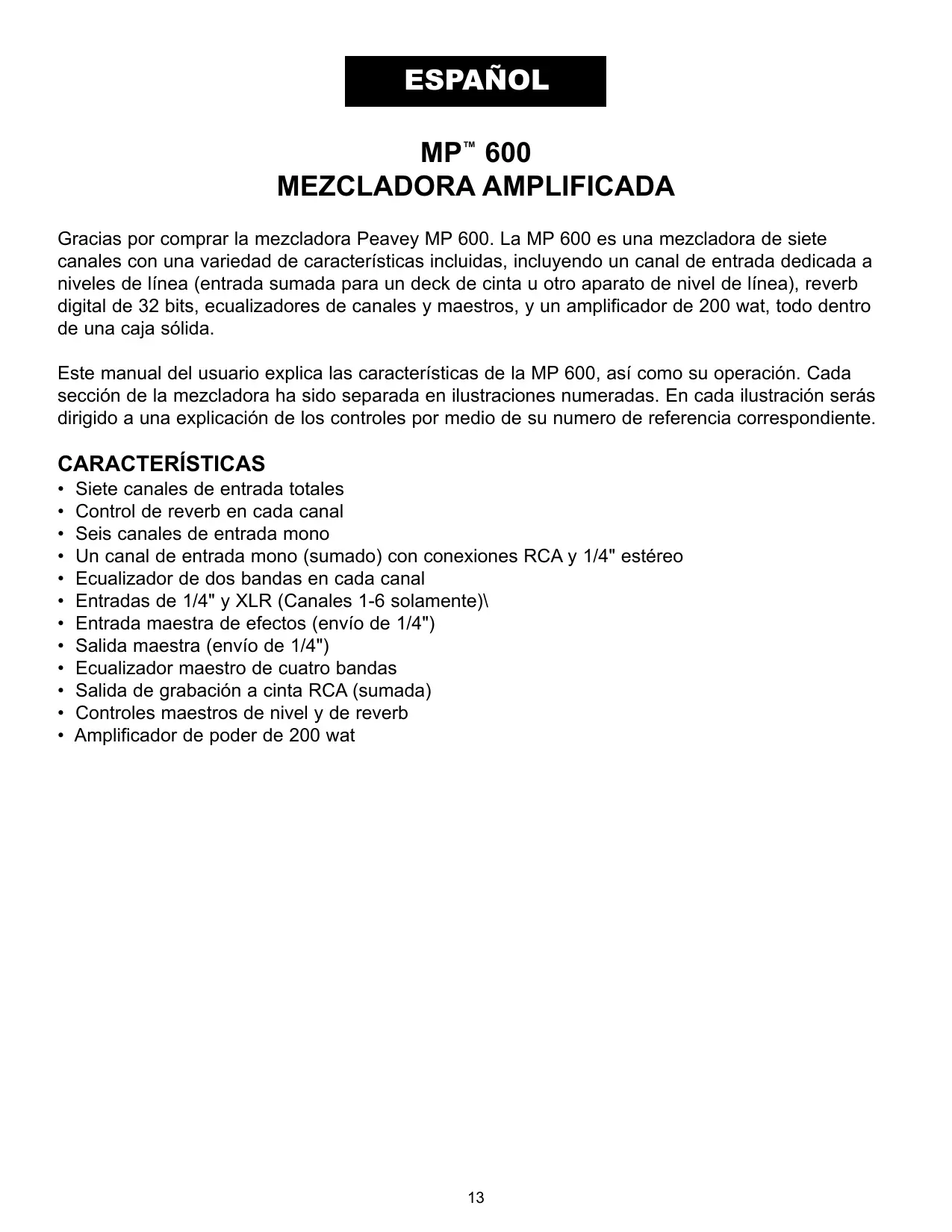 Este símbolo tiene el propósito, de alertar al usuario de la presencia de “(voltaje) peligroso” sin aislamiento dentro de la caja del producto y que puede tener una magnitud suficiente como para constituir riesgo de descarga eléctrica. Este símbolo tiene el propósito de alertar al usario de la presencia de instruccones importantes sobre la operación y mantenimiento en la información que viene con el producto. PRECAUCION: Riesgo de descarga eléctrica ¡NO ABRIR! PRECAUCION: Para disminuír el riesgo de descarga eléctrica, no abra la cubierta. No hay piezas útiles dentro. Deje todo mantenimiento en manos del personal técnico cualificado. ADVERTENCIA: Para evitar descargas eléctricas o peligro de incendio, no deje expuesto a la lluvia o humedad este aparato Antes de usar este aparato, Iea más advertencias en la guía de operación. ESPAÑOL MP™ 600 MEZCLADORA AMPLIFICADA Gracias por comprar la mezcladora Peavey MP 600. La MP 600 es una mezcladora de siete canales con una variedad de características incluidas, incluyendo un canal de entrada dedicada a niveles de línea (entrada sumada para un deck de cinta u otro aparato de nivel de línea), reverb digital de 32 bits, ecualizadores de canales y maestros, y un amplificador de 200 wat, todo dentro de una caja sólida. Este manual del usuario explica las características de la MP 600, así como su operación. Cada sección de la mezcladora ha sido separada en ilustraciones numeradas. En cada ilustración serás dirigido a una explicación de los controles por medio de su numero de referencia correspondiente. CARACTERÍSTICAS