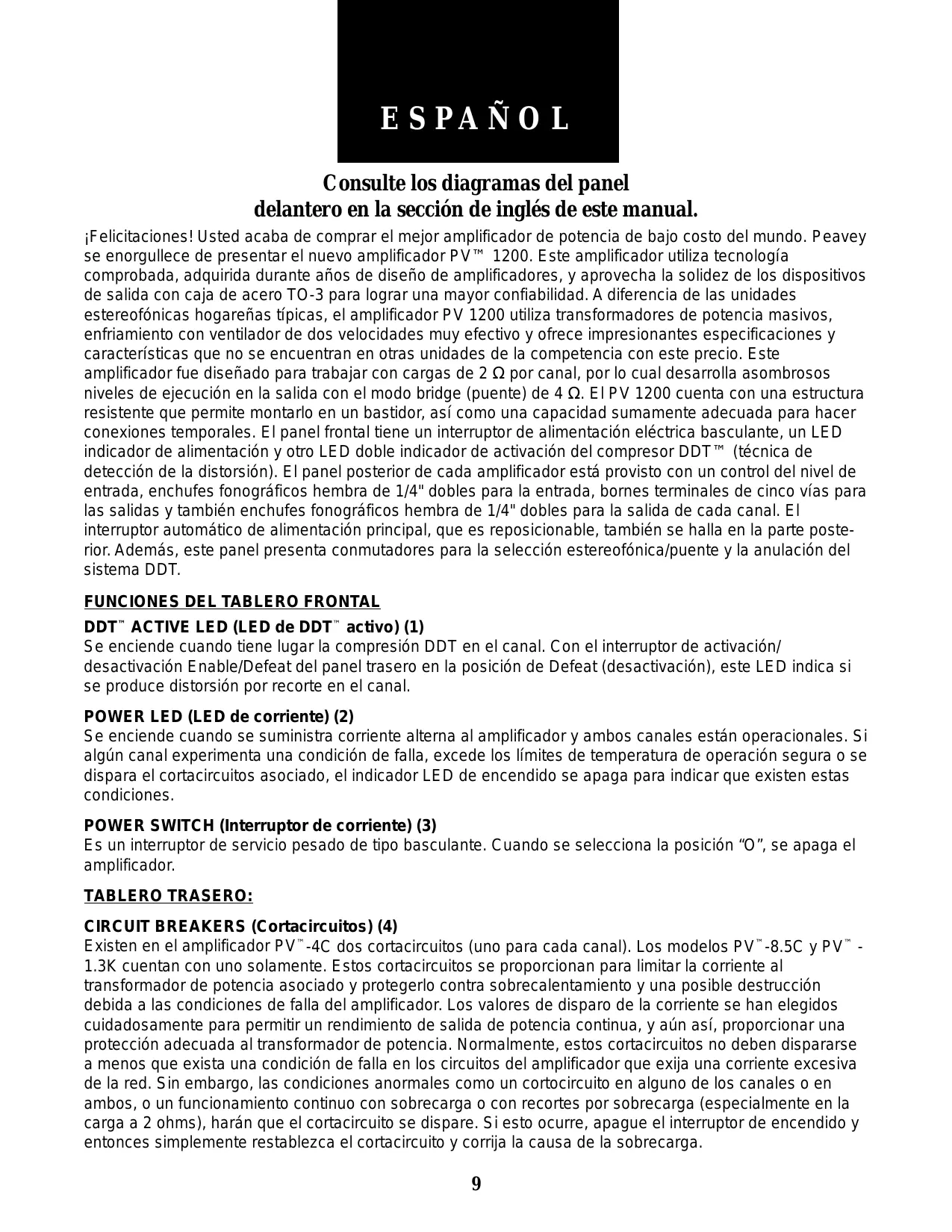 E S PA Ñ O L Consulte los diagramas del panel delantero en la sección de inglés de este manual. ¡Felicitaciones! Usted acaba de comprar el mejor amplificador de potencia de bajo costo del mundo. Peavey se enorgullece de presentar el nuevo amplificador PV™ 1200. Este amplificador utiliza tecnología comprobada, adquirida durante años de diseño de amplificadores, y aprovecha la solidez de los dispositivos de salida con caja de acero TO-3 para lograr una mayor confiabilidad. A diferencia de las unidades estereofónicas hogareñas típicas, el amplificador PV 1200 utiliza transformadores de potencia masivos, enfriamiento con ventilador de dos velocidades muy efectivo y ofrece impresionantes especificaciones y características que no se encuentran en otras unidades de la competencia con este precio. Este amplificador fue diseñado para trabajar con cargas de 2 Ω por canal, por lo cual desarrolla asombrosos niveles de ejecución en la salida con el modo bridge (puente) de 4 Ω. El PV 1200 cuenta con una estructura resistente que permite montarlo en un bastidor, así como una capacidad sumamente adecuada para hacer conexiones temporales. El panel frontal tiene un interruptor de alimentación eléctrica basculante, un LED indicador de alimentación y otro LED doble indicador de activación del compresor DDT™ (técnica de detección de la distorsión). El panel posterior de cada amplificador está provisto con un control del nivel de entrada, enchufes fonográficos hembra de 1/4" dobles para la entrada, bornes terminales de cinco vías para las salidas y también enchufes fonográficos hembra de 1/4" dobles para la salida de cada canal. El interruptor automático de alimentación principal, que es reposicionable, también se halla en la parte posterior. Además, este panel presenta conmutadores para la selección estereofónica/puente y la anulación del sistema DDT.