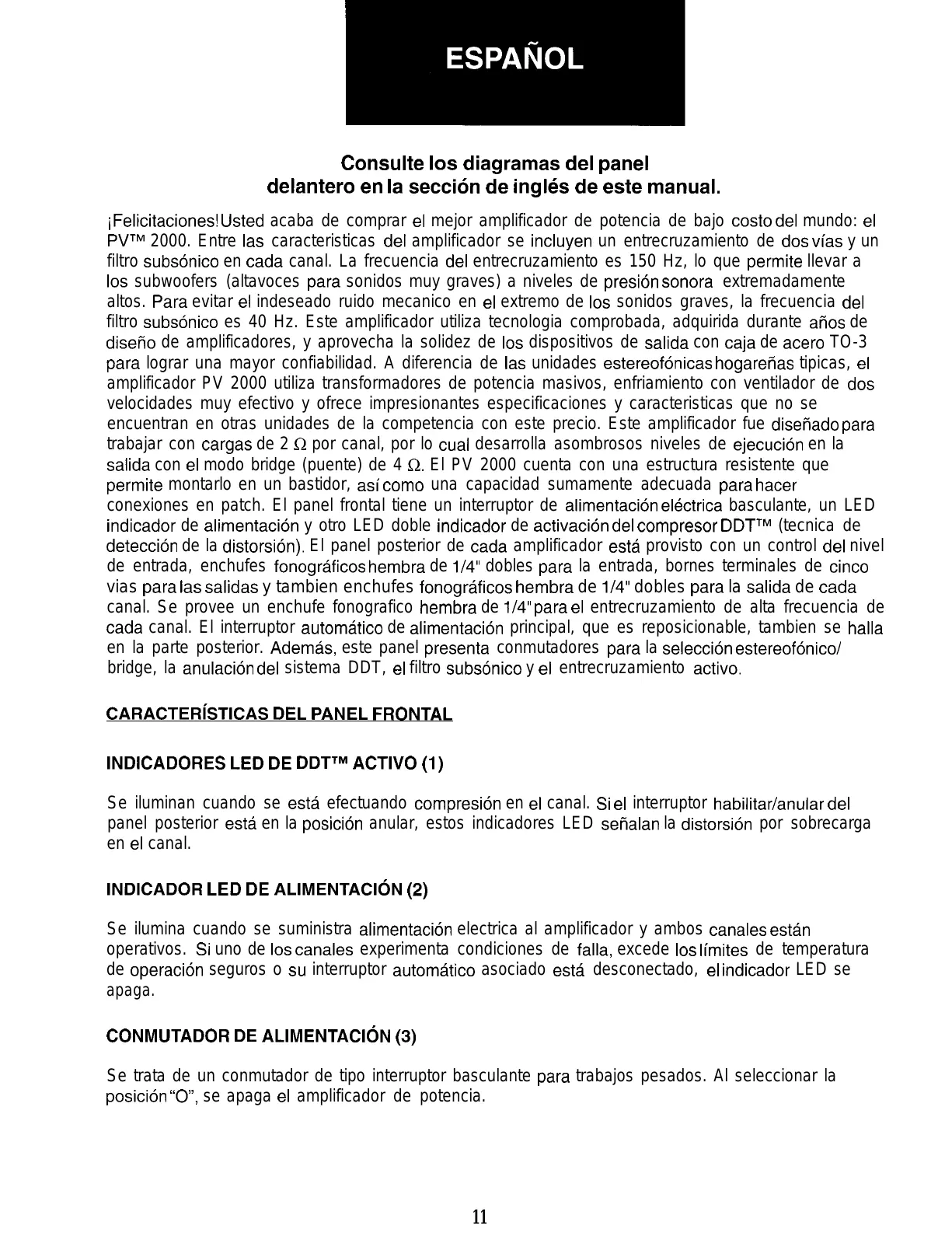 Consulte 10s diagramas del panel delantero en la seccih de inglb de este manual. jfelicitaciones! Usted acaba de comprar el mejor amplificador de potencia de bajo costo del mundo: el PVTM 2000. Entre las caracteristicas del amplificador se in¥ un entrecruzamiento de dos vias y un filtro subsonic0 en cada canal. La frecuencia del entrecruzamiento es 150 Hz, lo que permite llevar a 10s subwoofers (altavoces para sonidos muy graves) a niveles de presion Sonora extremadamente altos. Para evitar el indeseado ruido mecanico en el extremo de 10s sonidos graves, la frecuencia del filtro subsonico es 40 Hz. Este amplificador utiliza tecnologia comprobada, adquirida durante ados de diseho de amplificadores, y aprovecha la solidez de 10s dispositivos de salida con caja de acero TO-3 para lograr una mayor confiabilidad. A diferencia de las unidades estereofonicas hogarehas tipicas, el amplificador PV 2000 utiliza transformadores de potencia masivos, enfriamiento con ventilador de dos velocidades muy efectivo y ofrece impresionantes especificaciones y caracteristicas que no se encuentran en otras unidades de la competencia con este precio. Este amplificador fue disehado para trabajar con cargas de 2 Q por canal, por lo cual desarrolla asombrosos niveles de ejecucion en la salida con el modo bridge (puente) de 4 R. El PV 2000 cuenta con una estructura resistente que permite montarlo en un bastidor, asi coma una capacidad sumamente adecuada para hater conexiones en patch. El panel frontal tiene un interruptor de alimentacion electrica basculante, un LED indicador de alimentacion y otro LED doble indicador de activation del compresor DDTTM (tecnica de detection de la distorsion). El panel posterior de cada amplificador esta provisto con un control del nivel de entrada, enchufes fonograficos hembra de l/4” dobles para la entrada, bornes terminales de cinco vias para las salidas y tambien enchufes fonograficos hembra de l/4” dobles para la salida de cada canal. Se provee un enchufe fonografico hembra de l/4” para el entrecruzamiento de alta frecuencia de cada canal. El interruptor automatic0 de alimentacion principal, que es reposicionable, tambien se halla en la parte posterior. Ademas, este panel presenta conmutadores para la selection estereofonico/ bridge, la anulacion del sistema DDT, el filtro subsonic0 y el entrecruzamiento active. CARACTERkTlCAS DEL PANEL FRONTAL INDICADORES LED DE DDTTM ACTIVO (1) Se iluminan cuando se esta efectuando compresion en el canal. Si el interruptor habilitar/anular del panel posterior esta en la position anular, estos indicadores LED serialan la distorsion por sobrecarga en el canal. INDICADOR LED DE ALlMENTACldN (2) Se ilumina cuando se suministra alimentacion electrica al amplificador y ambos canales estan operativos. Si uno de 10s canales experimenta condiciones de falla, excede 10s limites de temperatura de operation seguros o su interruptor automatic0 asociado esta desconectado, el indicador LED se apaga. CONMUTADOR DE ALlMENTACldN (3) Se trata de un conmutador de tipo interruptor basculante para trabajos pesados. Al seleccionar la position “O”, se apaga el amplificador de potencia.