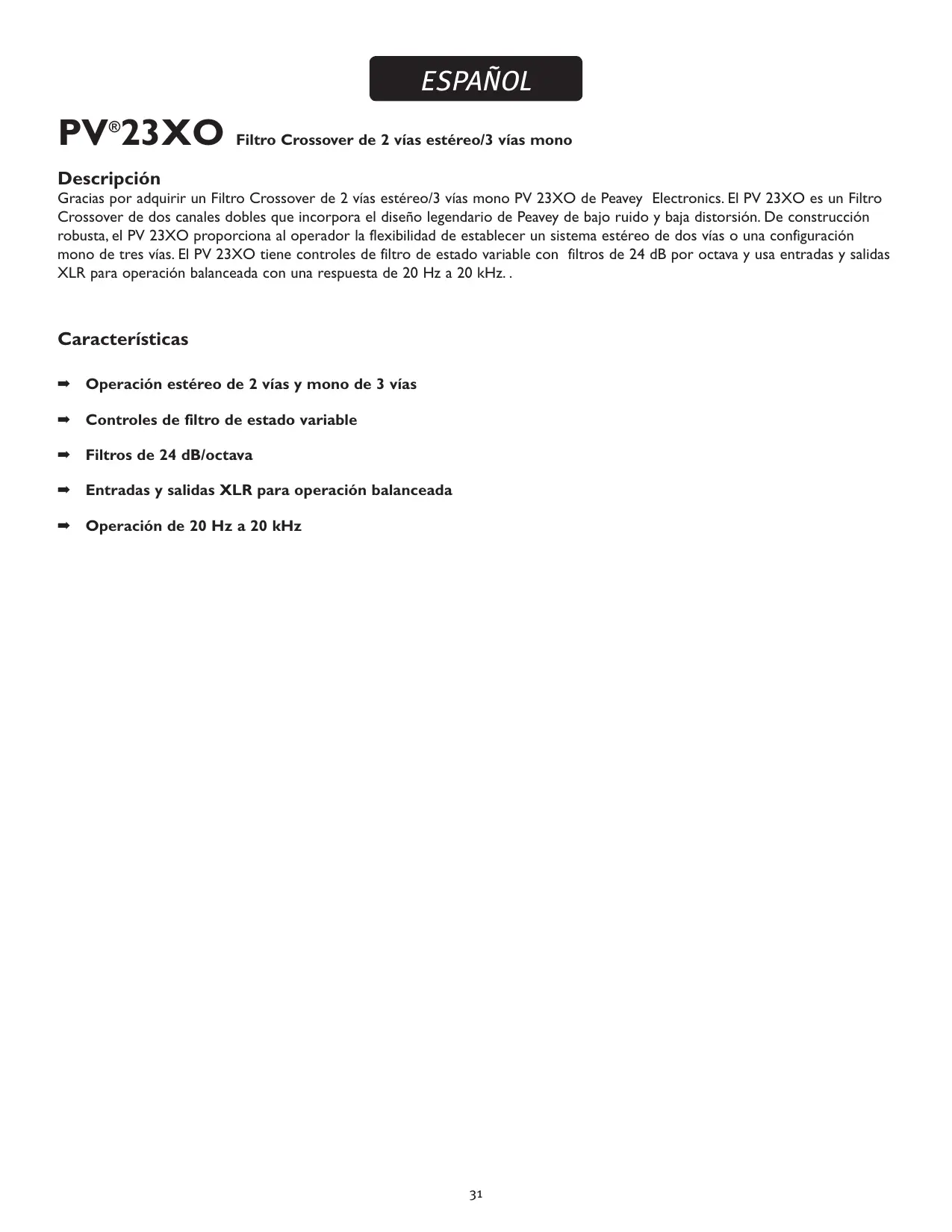 ENGLISH PV®23XO Filtro Crossover de 2 vías estéreo/3 vías mono Descripción Gracias por adquirir un Filtro Crossover de 2 vías estéreo/3 vías mono PV 23XO de Peavey Electronics. El PV 23XO es un Filtro Crossover de dos canales dobles que incorpora el diseño legendario de Peavey de bajo ruido y baja distorsión. De construcción robusta, el PV 23XO proporciona al operador la flexibilidad de establecer un sistema estéreo de dos vías o una configuración mono de tres vías. El PV 23XO tiene controles de filtro de estado variable con filtros de 24 dB por octava y usa entradas y salidas XLR para operación balanceada con una respuesta de 20 Hz a 20 kHz. . Características ➡ Operación estéreo de 2 vías y mono de 3 vías ➡ Controles de filtro de estado variable ➡ Filtros de 24 dB/octava ➡ Entradas y salidas XLR para operación balanceada ➡ Operación de 20 Hz a 20 kHz