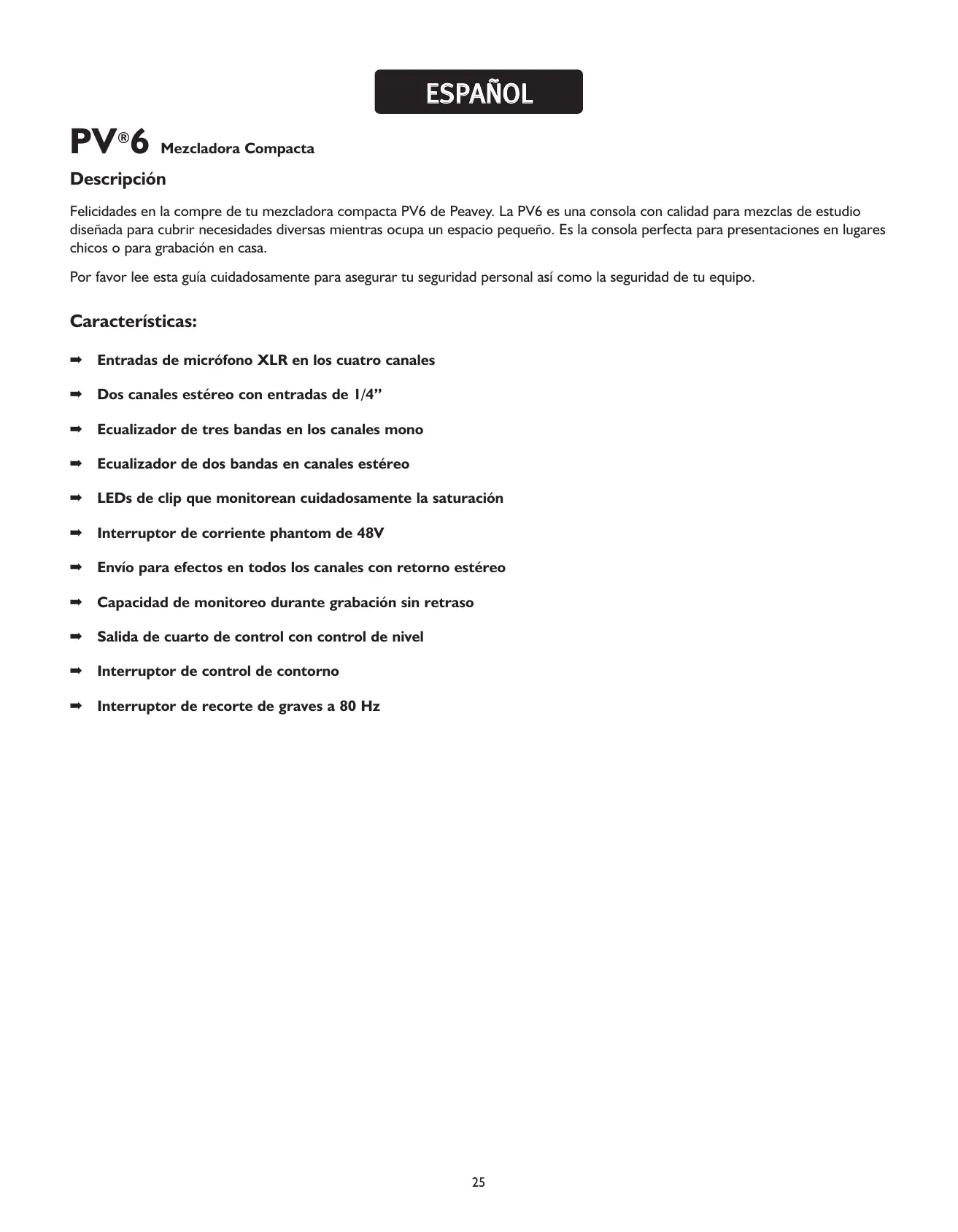 ESPAÑOL PV®6 Mezcladora Compacta Descripción Felicidades en la compre de tu mezcladora compacta PV6 de Peavey. La PV6 es una consola con calidad para mezclas de estudio diseñada para cubrir necesidades diversas mientras ocupa un espacio pequeño. Es la consola perfecta para presentaciones en lugares chicos o para grabación en casa. Por favor lee esta guía cuidadosamente para asegurar tu seguridad personal así como la seguridad de tu equipo. Características: ➡ Entradas de micrófono XLR en los cuatro canales ➡ Dos canales estéreo con entradas de 1/4” ➡ Ecualizador de tres bandas en los canales mono ➡ Ecualizador de dos bandas en canales estéreo ➡ LEDs de clip que monitorean cuidadosamente la saturación ➡ Interruptor de corriente phantom de 48V ➡ Envío para efectos en todos los canales con retorno estéreo ➡ Capacidad de monitoreo durante grabación sin retraso ➡ Salida de cuarto de control con control de nivel ➡ Interruptor de control de contorno ➡ Interruptor de recorte de graves a 80 Hz
