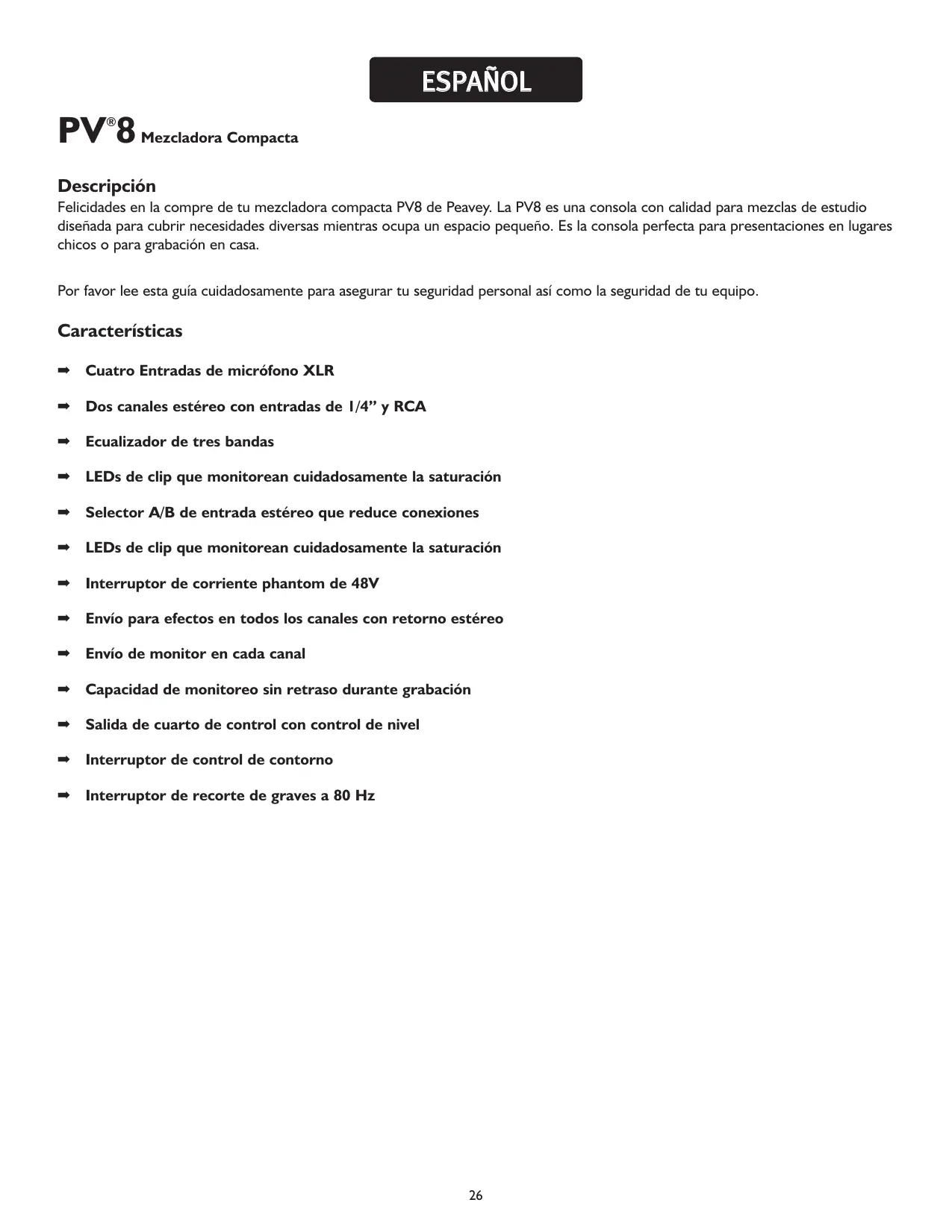 Descripción Felicidades en la compre de tu mezcladora compacta PV8 de Peavey. La PV8 es una consola con calidad para mezclas de estudio diseñada para cubrir necesidades diversas mientras ocupa un espacio pequeño. Es la consola perfecta para presentaciones en lugares chicos o para grabación en casa. Por favor lee esta guía cuidadosamente para asegurar tu seguridad personal así como la seguridad de tu equipo. Características ➡ Cuatro Entradas de micrófono XLR ➡ Dos canales estéreo con entradas de 1/4” y RCA ➡ Ecualizador de tres bandas ➡ LEDs de clip que monitorean cuidadosamente la saturación ➡ Selector A/B de entrada estéreo que reduce conexiones ➡ LEDs de clip que monitorean cuidadosamente la saturación ➡ Interruptor de corriente phantom de 48V ➡ Envío para efectos en todos los canales con retorno estéreo ➡ Envío de monitor en cada canal ➡ Capacidad de monitoreo sin retraso durante grabación ➡ Salida de cuarto de control con control de nivel ➡ Interruptor de control de contorno ➡ Interruptor de recorte de graves a 80 Hz