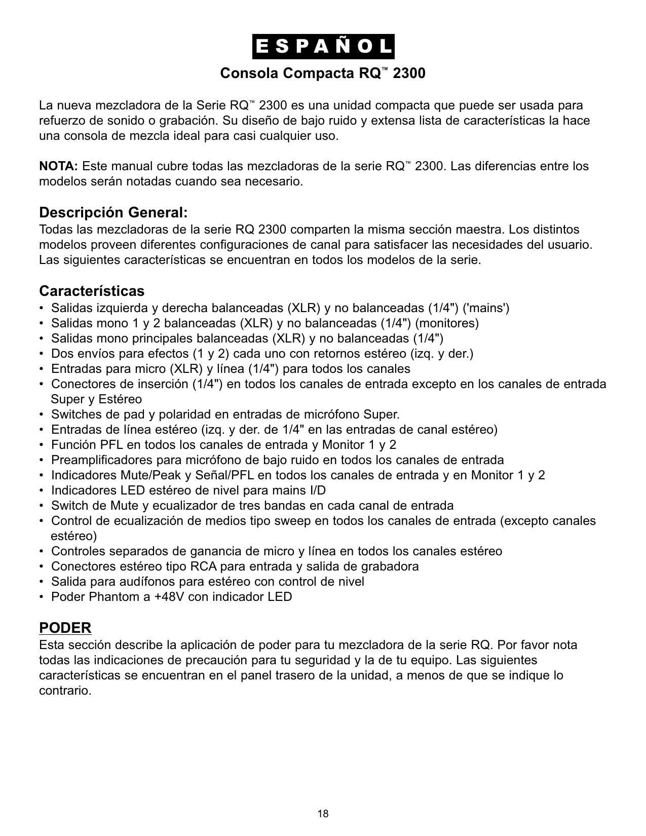 Salidas izquierda y derecha balanceadas (XLR) y no balanceadas (1/4") ('mains') Salidas mono 1 y 2 balanceadas (XLR) y no balanceadas (1/4") (monitores) Salidas mono principales balanceadas (XLR) y no balanceadas (1/4") Dos envíos para efectos (1 y 2) cada uno con retornos estéreo (izq. y der.) Entradas para micro (XLR) y línea (1/4") para todos los canales Conectores de inserción (1/4") en todos los canales de entrada excepto en los canales de entrada Super y Estéreo Switches de pad y polaridad en entradas de micrófono Super. Entradas de línea estéreo (izq. y der. de 1/4" en las entradas de canal estéreo) Función PFL en todos los canales de entrada y Monitor 1 y 2 Preamplificadores para micrófono de bajo ruido en todos los canales de entrada Indicadores Mute/Peak y Señal/PFL en todos los canales de entrada y en Monitor 1 y 2 Indicadores LED estéreo de nivel para mains I/D Switch de Mute y ecualizador de tres bandas en cada canal de entrada Control de ecualización de medios tipo sweep en todos los canales de entrada (excepto canales estéreo) Controles separados de ganancia de micro y línea en todos los canales estéreo Conectores estéreo tipo RCA para entrada y salida de grabadora Salida para audífonos para estéreo con control de nivel Poder Phantom a +48V con indicador LED PODER Esta sección describe la aplicación de poder para tu mezcladora de la serie RQ. Por favor nota todas las indicaciones de precaución para tu seguridad y la de tu equipo. Las siguientes características se encuentran en el panel trasero de la unidad, a menos de que se indique lo contrario.