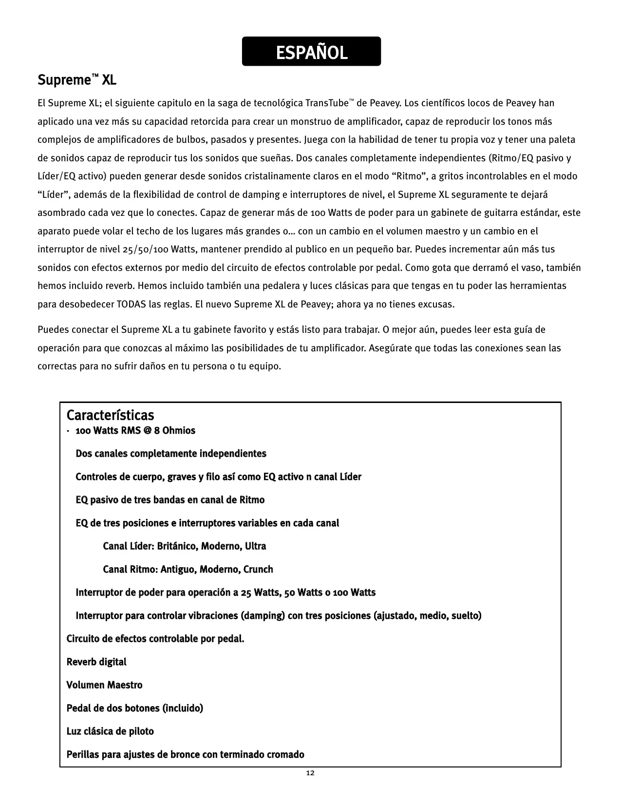 SUPREME XL - Amplificador de guitarra PEAVEY - Manual de uso y guía de instrucciones gratis