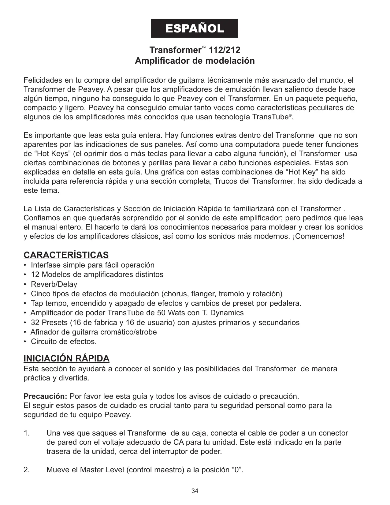 Amplificador de modelación Felicidades en tu compra del amplificador de guitarra técnicamente más avanzado del mundo, el Transformer de Peavey. A pesar que los amplificadores de emulación llevan saliendo desde hace algún tiempo, ninguno ha conseguido lo que Peavey con el Transformer. En un paquete pequeño, compacto y ligero, Peavey ha conseguido emular tanto voces como características peculiares de algunos de los amplificadores más conocidos que usan tecnología TransTube®. Es importante que leas esta guía entera. Hay funciones extras dentro del Transforme que no son aparentes por las indicaciones de sus paneles. Así como una computadora puede tener funciones de “Hot Keys” (el oprimir dos o más teclas para llevar a cabo alguna función), el Transformer usa ciertas combinaciones de botones y perillas para llevar a cabo funciones especiales. Estas son explicadas en detalle en esta guía. Una gráfica con estas combinaciones de “Hot Key” ha sido incluida para referencia rápida y una sección completa, Trucos del Transformer, ha sido dedicada a este tema. La Lista de Características y Sección de Iniciación Rápida te familiarizará con el Transformer . Confiamos en que quedarás sorprendido por el sonido de este amplificador; pero pedimos que leas el manual entero. El hacerlo te dará los conocimientos necesarios para moldear y crear los sonidos y efectos de los amplificadores clásicos, así como los sonidos más modernos. ¡Comencemos!