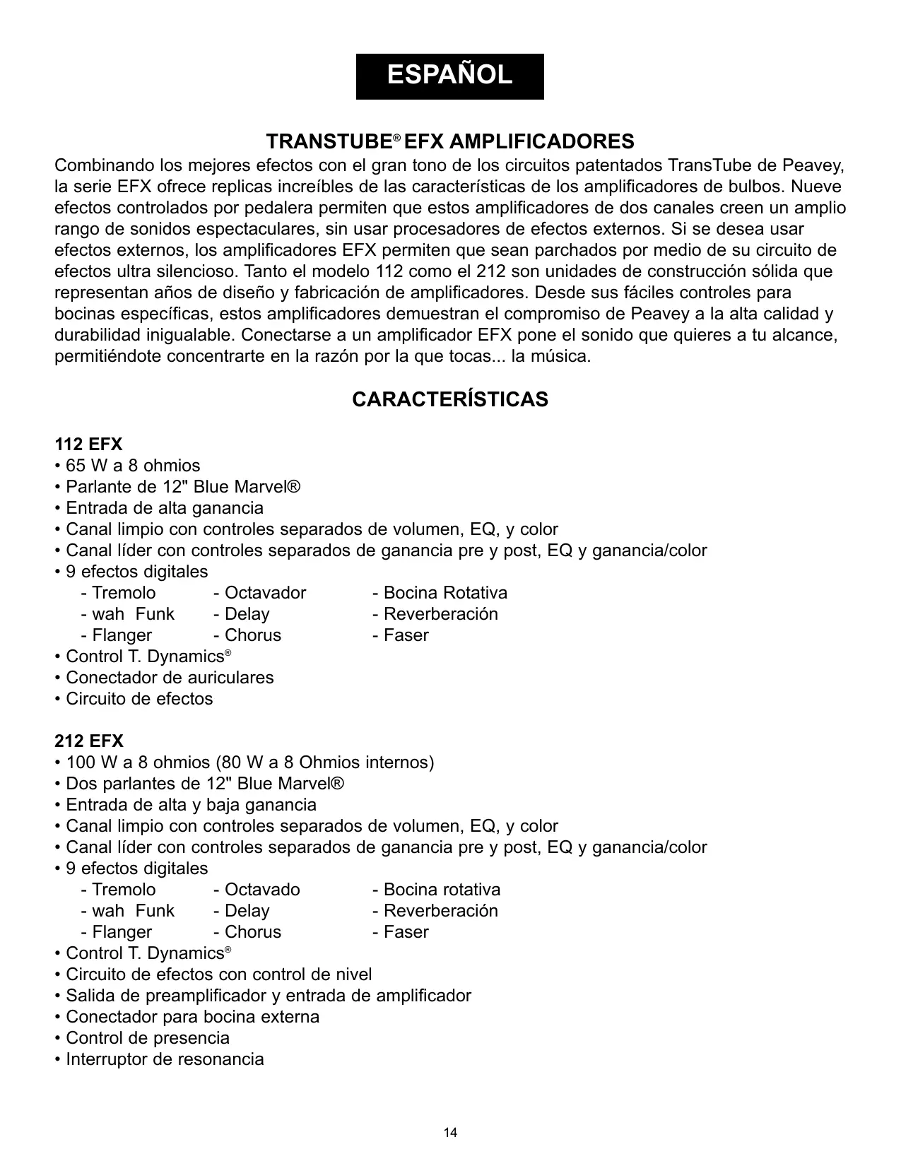 ESPAÑOL TRANSTUBE® EFX AMPLIFICADORES Combinando los mejores efectos con el gran tono de los circuitos patentados TransTube de Peavey, la serie EFX ofrece replicas increíbles de las características de los amplificadores de bulbos. Nueve efectos controlados por pedalera permiten que estos amplificadores de dos canales creen un amplio rango de sonidos espectaculares, sin usar procesadores de efectos externos. Si se desea usar efectos externos, los amplificadores EFX permiten que sean parchados por medio de su circuito de efectos ultra silencioso. Tanto el modelo 112 como el 212 son unidades de construcción sólida que representan años de diseño y fabricación de amplificadores. Desde sus fáciles controles para bocinas específicas, estos amplificadores demuestran el compromiso de Peavey a la alta calidad y durabilidad inigualable. Conectarse a un amplificador EFX pone el sonido que quieres a tu alcance, permitiéndote concentrarte en la razón por la que tocas... la música.