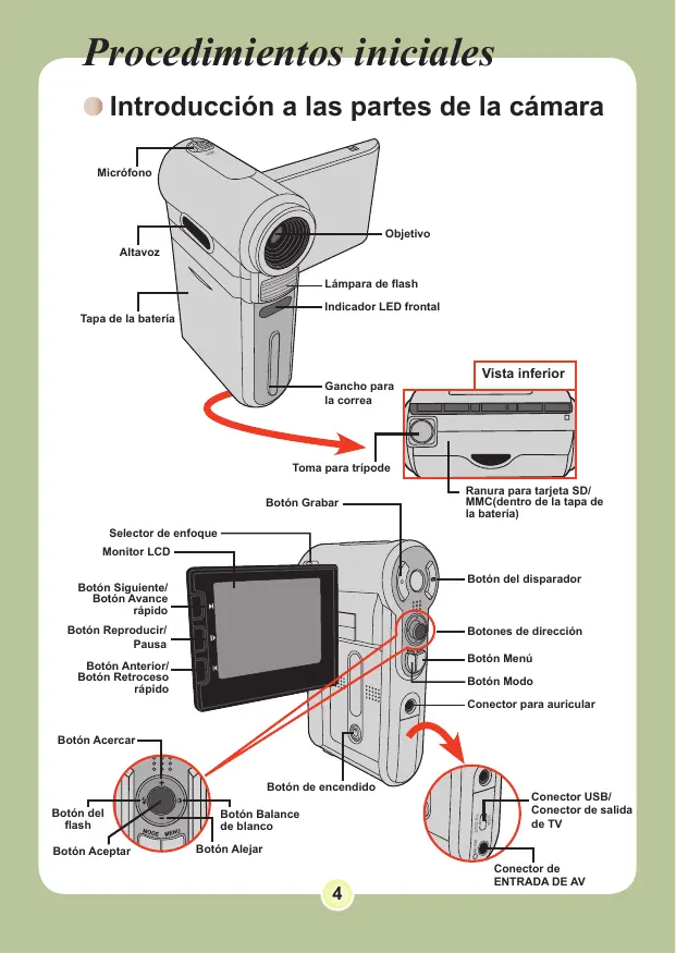 Procedimientos iniciales Introduccién a las partes de la câmara Micréfono Vista inferior Gancho para Toma para Li [= L Ranura para tarjeta SD/ MMC(dontro do la tapa de à bateria) Botén Grabar Selector de enfoque Botén del disparador Botén Reproducir! }— Botones de direcciôn Pausa pBeté Anteror Botôn Menü jotôn Retroceo oo répido Botén Mode onector para auricular Conactor de salida [ÿ] de blanco