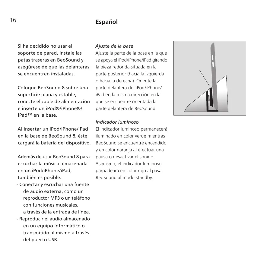 Si ha decidido no usar el soporte de pared, instale las patas traseras en BeoSound y asegúrese de que las delanteras se encuentren instaladas. Coloque BeoSound 8 sobre una superficie plana y estable, conecte el cable de alimentación e inserte un iPod®/iPhone®/ iPad™ en la base. Al insertar un iPod/iPhone/iPad en la base de BeoSound 8, éste cargará la batería del dispositivo. Además de usar BeoSound 8 para escuchar la música almacenada en un iPod/iPhone/iPad, también es posible: - Conectar y escuchar una fuente de audio externa, como un reproductor MP3 o un teléfono con funciones musicales, a través de la entrada de línea. - Reproducir el audio almacenado en un equipo informático o transmitido al mismo a través del puerto USB.