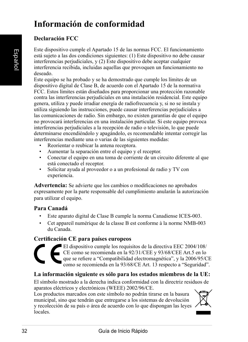 El símbolo mostrado a la derecha indica conformidad con la directriz residuos de aparatos eléctricos y electrónicos (WEEE) 2002/96/CE. Los productos marcados con este símbolo no podrán tirarse en la basura municipal, sino que tendrán que entregarse a los sistemas de devolución y recolección de su país o área de acuerdo con lo que dispongan las leyes locales. 32
