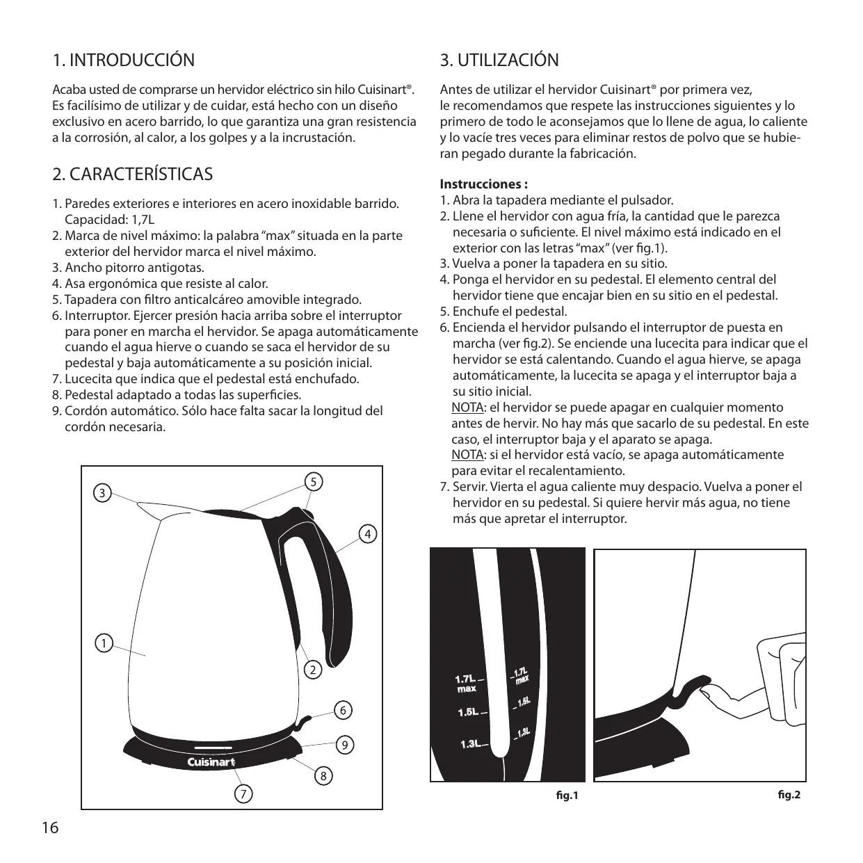 Acaba usted de comprarse un hervidor eléctrico sin hilo Cuisinart®. Es facilísimo de utilizar y de cuidar, está hecho con un diseño exclusivo en acero barrido, lo que garantiza una gran resistencia a la corrosión, al calor, a los golpes y a la incrustación. Antes de utilizar el hervidor Cuisinart® por primera vez, le recomendamos que respete las instrucciones siguientes y lo primero de todo le aconsejamos que lo llene de agua, lo caliente y lo vacíe tres veces para eliminar restos de polvo que se hubieran pegado durante la fabricación.