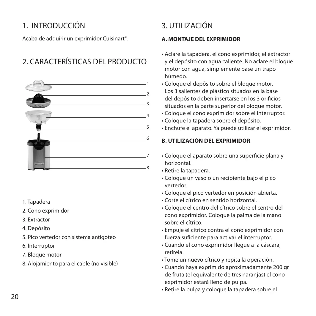 CONTENIDO 1. Introducción . . . . . . . . . . . . . . . . . . . . . . . . . . . . . . . . . . . . . . . . . . . . . . . . . . . . . . . . 2. Características del producto . . . . . . . . . . . . . . . . . . . . . . . . . . . . . . . . . . . . . . . . . . . . . . . 3. Utilización . . . . . . . . . . . . . . . . . . . . . . . . . . . . . . . . . . . . . . . . . . . . . . . . . . . . . . . . . . A. Montaje del aparato . . . . . . . . . . . . . . . . . . . . . . . . . . . . . . . . . . . . . . . . . . . . . . . B. Utilización del exprimidor . . . . . . . . . . . . . . . . . . . . . . . . . . . . . . . . . . . . . . . . . . . . C. Consejos de utilización del exprimidor . . . . . . . . . . . . . . . . . . . . . . . . . . . . . . . . . . . . 4. Limpiar y guardar . . . . . . . . . . . . . . . . . . . . . . . . . . . . . . . . . . . . . . . . . . . . . . . . . . . . . . 5. Consignas de seguridad . . . . . . . . . . . . . . . . . . . . . . . . . . . . . . . . . . . . . . . . . . . . . . . . . .