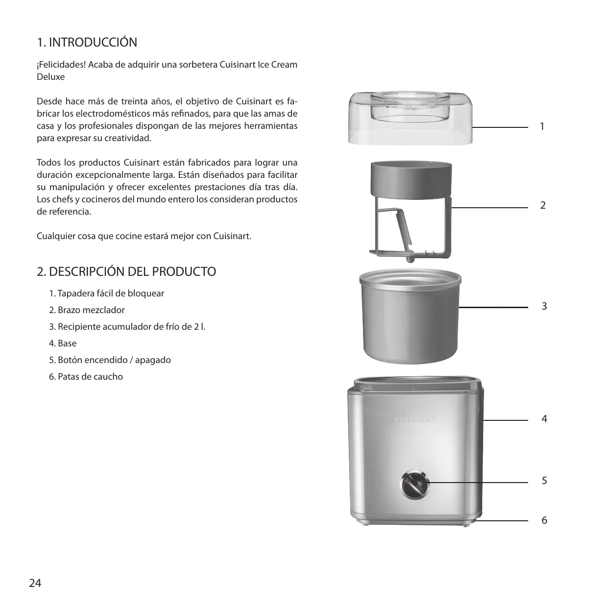 ¡Felicidades! Acaba de adquirir una sorbetera Cuisinart Ice Cream Deluxe Desde hace más de treinta años, el objetivo de Cuisinart es fabricar los electrodomésticos más refinados, para que las amas de casa y los profesionales dispongan de las mejores herramientas para expresar su creatividad. Todos los productos Cuisinart están fabricados para lograr una duración excepcionalmente larga. Están diseñados para facilitar su manipulación y ofrecer excelentes prestaciones día tras día. Los chefs y cocineros del mundo entero los consideran productos de referencia.