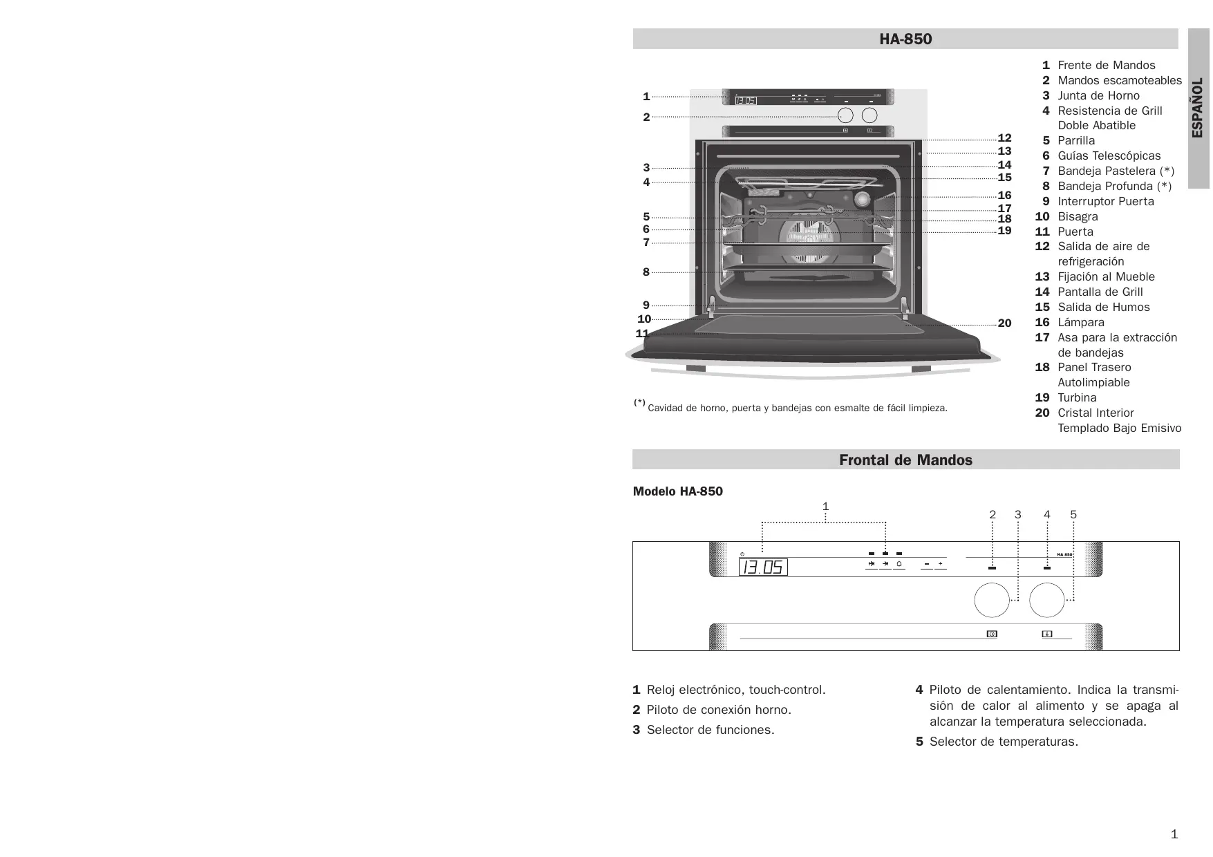 Cavidad de horno, puerta y bandejas con esmalte de fácil limpieza. Frente de Mandos Mandos escamoteables Junta de Horno Resistencia de Grill Doble Abatible Parrilla Guías Telescópicas Bandeja Pastelera (*) Bandeja Profunda (*) Interruptor Puerta Bisagra Puerta Salida de aire de refrigeración Fijación al Mueble Pantalla de Grill Salida de Humos Lámpara Asa para la extracción de bandejas Panel Trasero Autolimpiable Turbina Cristal Interior Templado Bajo Emisivo Frontal de Mandos Modelo HA-850
