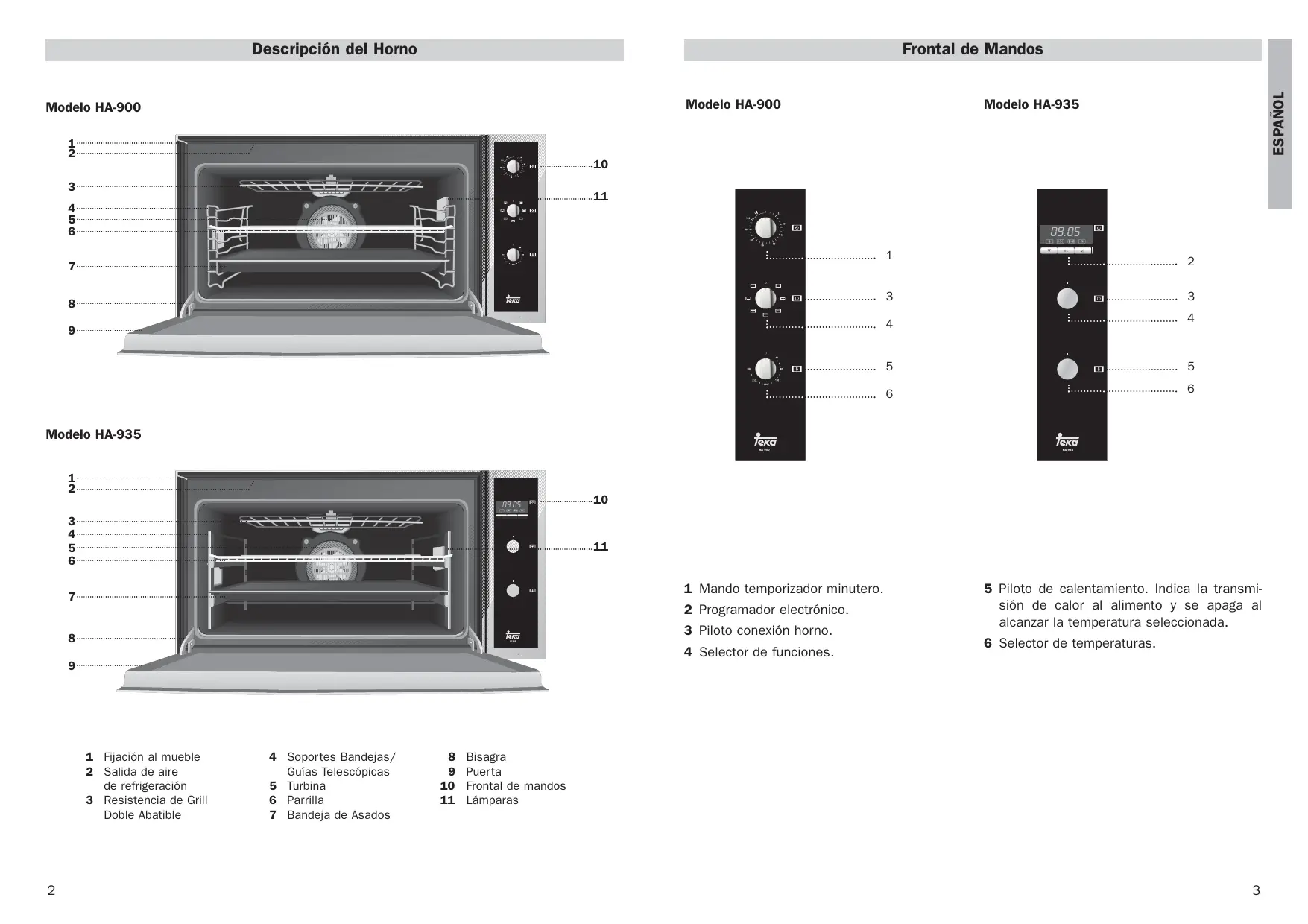 Desconexión del horno Convencional Se usa en bizcochos y tartas en los que el calor recibido debe ser uniforme y para que consigan una textura esponjosa. como aves, caza,... Se recomienda colocar la pieza de carne sobre la parrilla del horno y la bandeja por debajo, para el escurrido de jugos o grasa. Modelo HA-900 Atención Durante el uso de la función Grill, MaxiGrill o MaxiGrill con Turbina la puerta debe mantenerse cerrada. 2 Seleccione una temperatura y una función de cocinado. Turbo La turbina reparte el calor que proviene de una resistencia situada en la parte trasera del horno. Por la uniformidad de la temperatura que se produce, permite cocinar en 2 alturas al mismo tiempo. Esta función también permite descongelar alimentos, colocando el selector de temperaturas en posición . Solera Calor sólo desde la parte inferior. Apropiado para calentar platos o levantar masas de repostería y afines. Grill Gratinado y asado superficial. Permite el dorado de la capa exterior sin afectar al interior del alimento. Indicado para piezas planas como bistec, costillas, pescado, tostadas. Solera con Turbina Distribuye el calor que proviene de la parte inferior del horno. Ideal para pasteles con relleno de mermelada o fruta, los cuales sólo requieren un aporte de calor inferior. Siempre es necesario un precalentamiento anterior. MaxiGrill con Turbina Permite el asado uniforme al mismo tiempo que dora superficialmente. Ideal para parrilladas. Especial para piezas con gran volumen