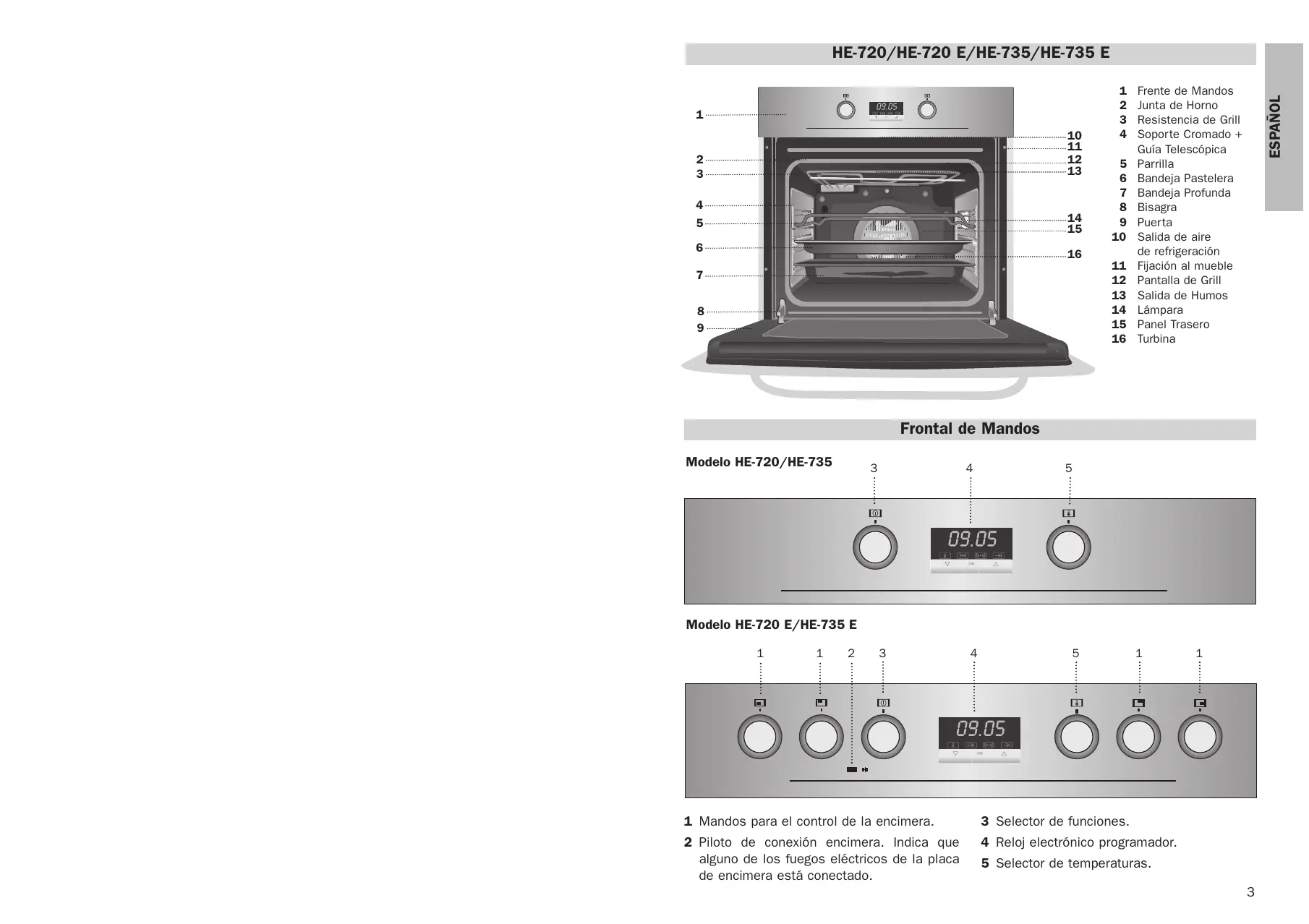 Frente de Mandos Junta de Horno Resistencia de Grill Soporte Cromado + Guía Telescópica Parrilla Bandeja Pastelera Bandeja Profunda Bisagra Puerta Salida de aire de refrigeración Fijación al mueble Pantalla de Grill Salida de Humos Lámpara Panel Trasero Turbina ESPAÑOL