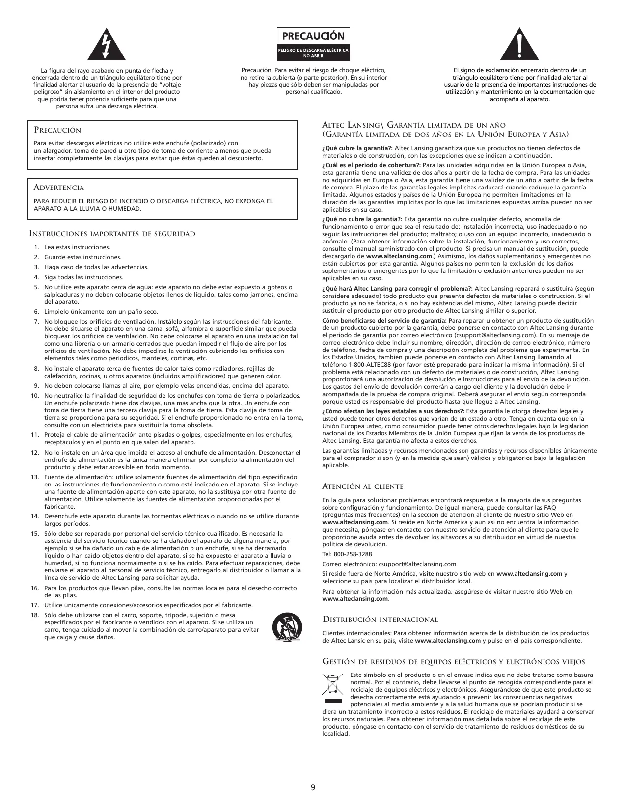 La figura del rayo acabado en punta de flecha y encerrada dentro de un triángulo equilátero tiene por finalidad alertar al usuario de la presencia de “voltaje peligroso” sin aislamiento en el interior del producto que podría tener potencia suficiente para que una persona sufra una descarga eléctrica. Precaución: Para evitar el riesgo de choque eléctrico, no retire la cubierta (o parte posterior). En su interior hay piezas que sólo deben ser manipuladas por personal cualificado. El signo de exclamación encerrado dentro de un triángulo equilátero tiene por finalidad alertar al usuario de la presencia de importantes instrucciones de utilización y mantenimiento en la documentación que acompaña al aparato. ALTEC LANSING\ GARANTÍA LIMITADA DE UN AÑO (GARANTÍA LIMITADA DE DOS AÑOS EN LA UNIÓN EUROPEA PRECAUCIÓN