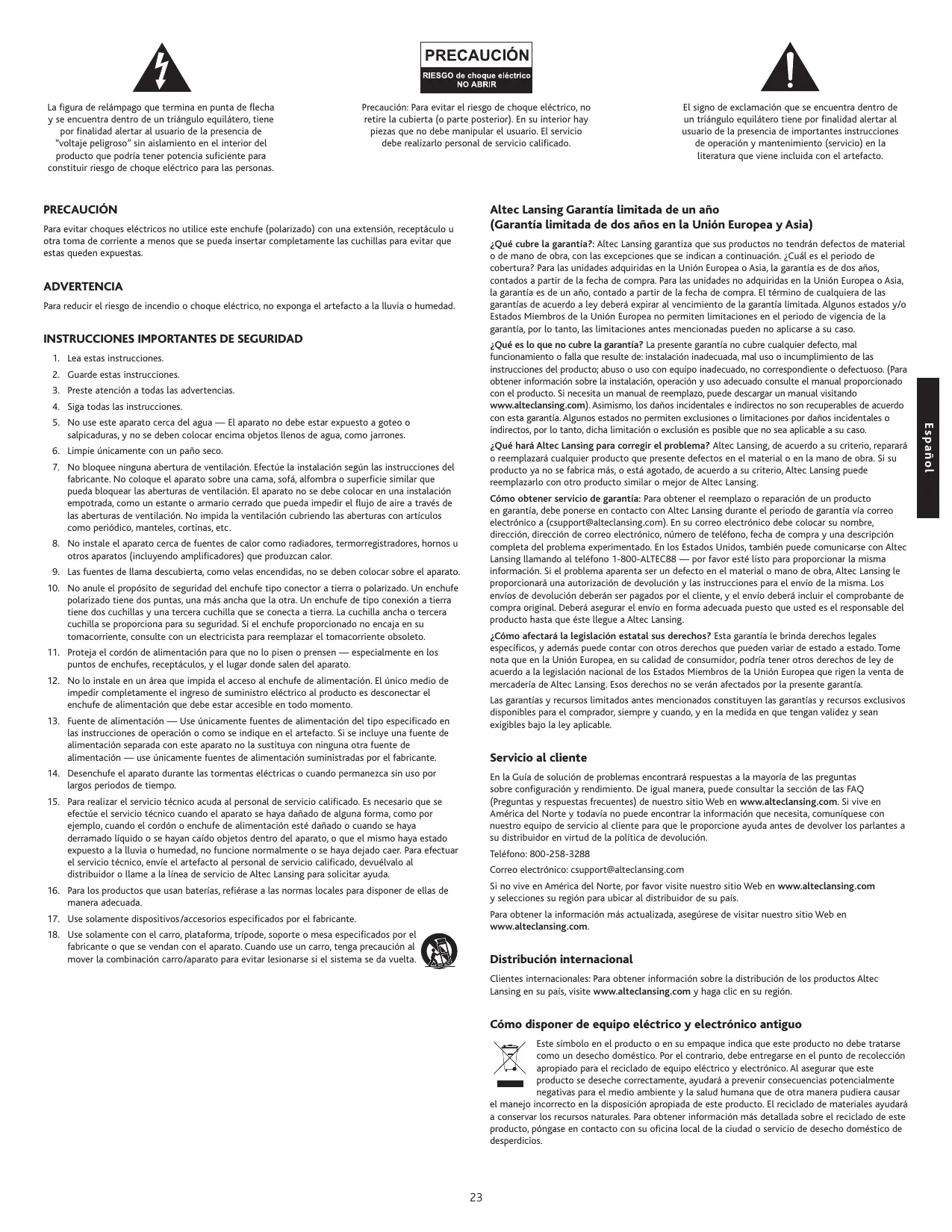 ¿Qué es lo que no cubre la garantía? La presente garantía no cubre cualquier defecto, mal funcionamiento o falla que resulte de: instalación inadecuada, mal uso o incumplimiento de las instrucciones del producto; abuso o uso con equipo inadecuado, no correspondiente o defectuoso. (Para obtener información sobre la instalación, operación y uso adecuado consulte el manual proporcionado con el producto. Si necesita un manual de reemplazo, puede descargar un manual visitando www.alteclansing.com). Asimismo, los daños incidentales e indirectos no son recuperables de acuerdo con esta garantía. Algunos estados no permiten exclusiones o limitaciones por daños incidentales o indirectos, por lo tanto, dicha limitación o exclusión es posible que no sea aplicable a su caso.