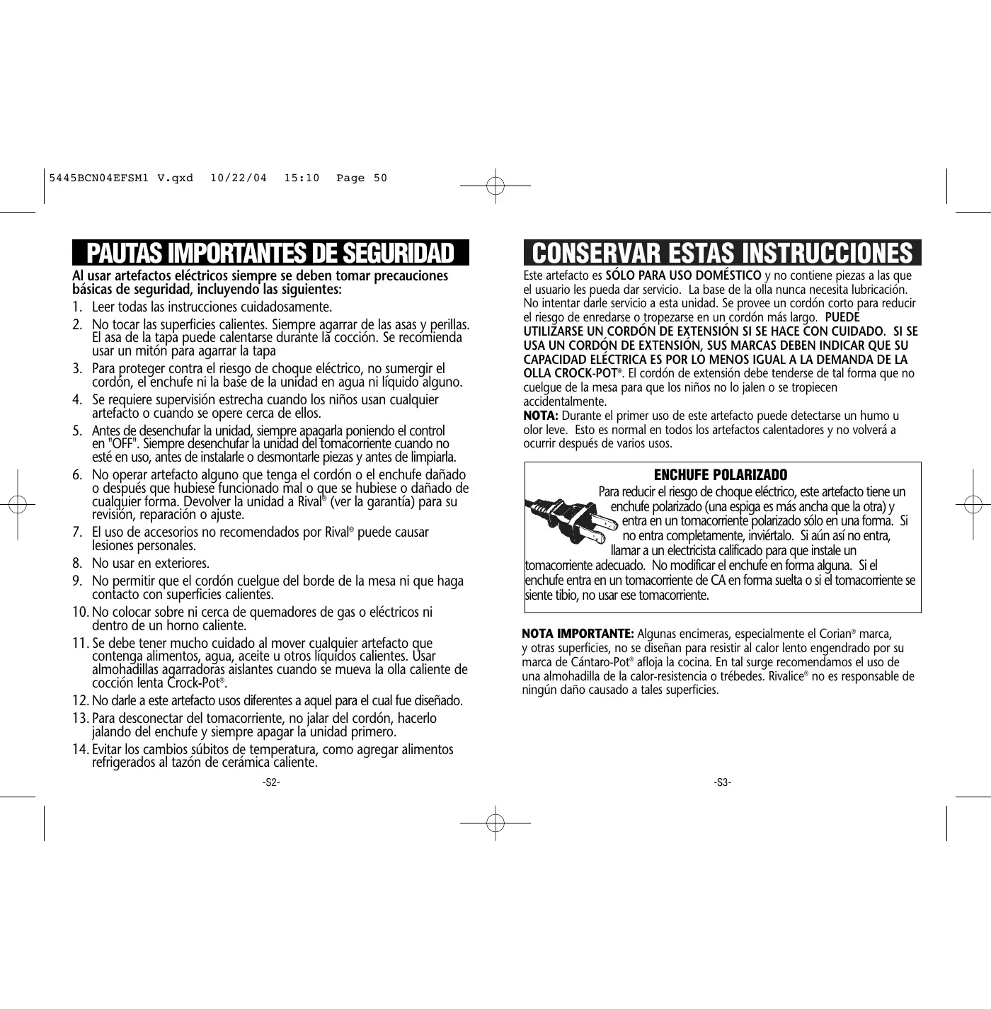 refrigerados al tazón de cerámica caliente. Este artefacto es SÓLO PARA USO DOMÉSTICO y no contiene piezas a las que el usuario les pueda dar servicio. La base de la olla nunca necesita lubricación. No intentar darle servicio a esta unidad. Se provee un cordón corto para reducir el riesgo de enredarse o tropezarse en un cordón más largo. PUEDE UTILIZARSE UN CORDÓN DE EXTENSIÓN SI SE HACE CON CUIDADO. SI SE USA UN CORDÓN DE EXTENSIÓN, SUS MARCAS DEBEN INDICAR QUE SU CAPACIDAD ELÉCTRICA ES POR LO MENOS IGUAL A LA DEMANDA DE LA OLLA CROCK-POT®. El cordón de extensión debe tenderse de tal forma que no cuelgue de la mesa para que los niños no lo jalen o se tropiecen accidentalmente. NOTA: Durante el primer uso de este artefacto puede detectarse un humo u olor leve. Esto es normal en todos los artefactos calentadores y no volverá a ocurrir después de varios usos. -S2- ENCHUFE POLARIZADO Para reducir el riesgo de choque eléctrico, este artefacto tiene un enchufe polarizado (una espiga es más ancha que la otra) y entra en un tomacorriente polarizado sólo en una forma. Si no entra completamente, inviértalo. Si aún así no entra, llamar a un electricista calificado para que instale un tomacorriente adecuado. No modificar el enchufe en forma alguna. Si el enchufe entra en un tomacorriente de CA en forma suelta o si el tomacorriente se siente tibio, no usar ese tomacorriente. NOTA IMPORTANTE: Algunas encimeras, especialmente el Corian® marca, y otras superficies, no se diseñan para resistir al calor lento engendrado por su marca de Cántaro-Pot® afloja la cocina. En tal surge recomendamos el uso de una almohadilla de la calor-resistencia o trébedes. Rivalice® no es responsable de ningún daño causado a tales superficies. -S3- 5445BCN04EFSM1 V.qxd 10/22/04 15:10 Page 52 COMO USAR LA OLLA DE COCCIÓN LENTA CROCK-POT®