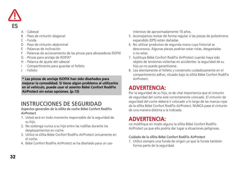 AirProtect 1. U sted será en todo momento responsable de la seguridad de su hijo. 2. No sostenga nunca a su hijo entre las rodillas durante los desplazamientos en coche. 3. Utilice la sillita Bébé Confort RodiFix AirProtect únicamente en el coche. 4. Bébé Confort RodiFix AirProtect se ha diseñado para un uso