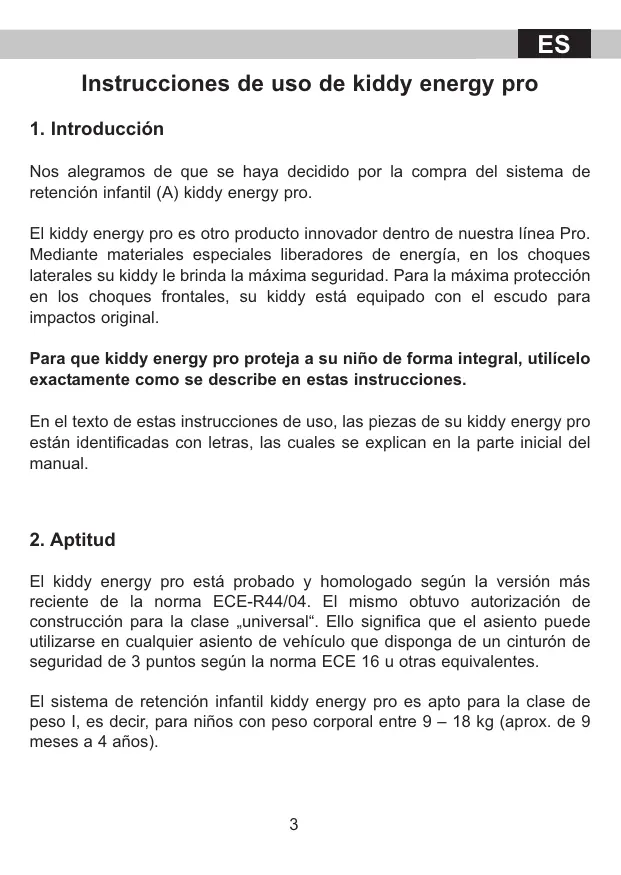 El sistema de retención infantil kiddy energy pro es apto para la clase de peso I, es decir, para niños con peso corporal entre 9 – 18 kg (aprox. de 9 meses a 4 años). 3
