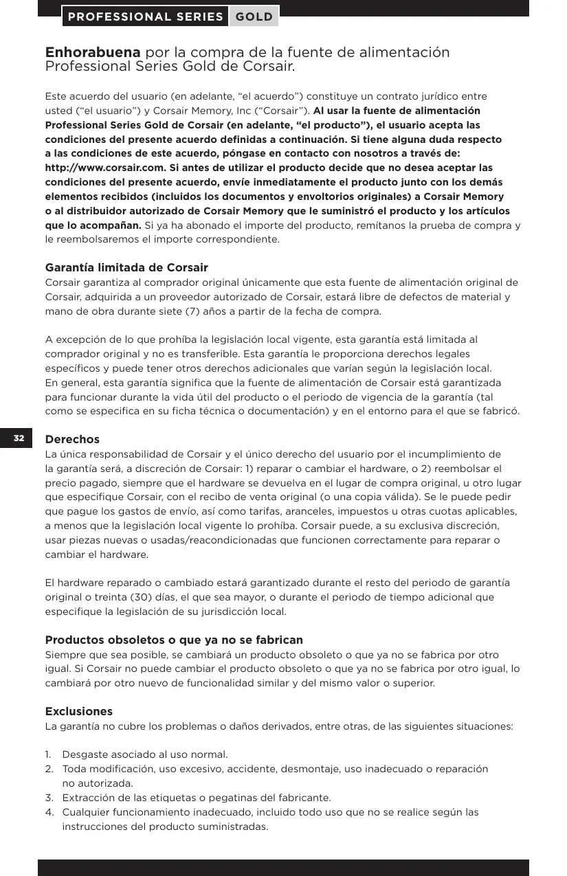 R 51318.22-99 R 51318.24-99 R 51317.3.2-2006 R 51317.3.3-99 ROHS 2002/95/CE, restrizione dell’uso di determinate sostanze pericolose nelle apparecchiature elettriche ed elettroniche WEEE 2002/96/CE, direttiva sui rifiuti di apparecchiature elettriche ed elettroniche ROHS (Cina) Articolo n° 39, amministrazione sul controllo dell’inquinamento causato da prodotti elettronici PROFESSIONAL SERIES GOLD Enhorabuena por la compra de la fuente de alimentación Professional Series Gold de Corsair. Este acuerdo del usuario (en adelante, “el acuerdo”) constituye un contrato jurídico entre usted (“el usuario”) y Corsair Memory, Inc (“Corsair”). Al usar la fuente de alimentación Professional Series Gold de Corsair (en adelante, “el producto”), el usuario acepta las condiciones del presente acuerdo definidas a continuación. Si tiene alguna duda respecto a las condiciones de este acuerdo, póngase en contacto con nosotros a través de: http://www.corsair.com. Si antes de utilizar el producto decide que no desea aceptar las condiciones del presente acuerdo, envíe inmediatamente el producto junto con los demás elementos recibidos (incluidos los documentos y envoltorios originales) a Corsair Memory o al distribuidor autorizado de Corsair Memory que le suministró el producto y los artículos que lo acompañan. Si ya ha abonado el importe del producto, remítanos la prueba de compra y le reembolsaremos el importe correspondiente. Garantía limitada de Corsair Corsair garantiza al comprador original únicamente que esta fuente de alimentación original de Corsair, adquirida a un proveedor autorizado de Corsair, estará libre de defectos de material y mano de obra durante siete (7) años a partir de la fecha de compra. A excepción de lo que prohíba la legislación local vigente, esta garantía está limitada al comprador original y no es transferible. Esta garantía le proporciona derechos legales específicos y puede tener otros derechos adicionales que varían según la legislación local. En general, esta garantía significa que la fuente de alimentación de Corsair está garantizada para funcionar durante la vida útil del producto o el periodo de vigencia de la garantía (tal como se especifica en su ficha técnica o documentación) y en el entorno para el que se fabricó.