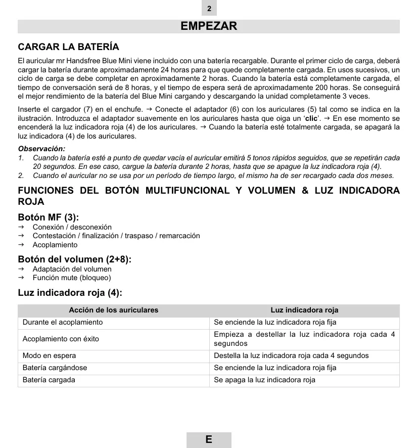 El auricular mr Handsfree Blue Mini viene incluido con una bateria recargable. Durante el primer ciclo de carga, debenargar la bateria durante aproximamente 24 horas para que quede Completely cargada. En usos sucesivos, un ciclo de carga se debe completar en aproximamente 2 horas. Cuando la bateria está Completely cargada, el tiempo de conversación sera de 8 horas, y el tiempo de espera sera de aproximamente 200 horas. Se sugirá el mejor rendimiento de la batería del Blue Mini cargando y descargando launidad Completely 3 vezes.