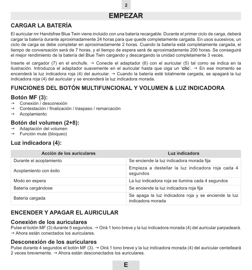 El auricular mr Handsfree Blue Twin viene incluo conuna bateria recargable.Durante el primer ciclo de carga,deferarcargar la bateria durante aproximamente 24 horas para que quedepletamente cargada.En usos sucesivos,un ciclo de carga se deibe completar enapproximamente 2 horas.Cuando la bateria estápletamente cargada,el tiempo de conversacion sera de 7 horas,y el tiempo de espera sera deapproximamente 200 horas.Se sugirai el mejor rendimiento de la bateria del Blue Twin cargando y descargando la unidadpletamente 3 vezes.