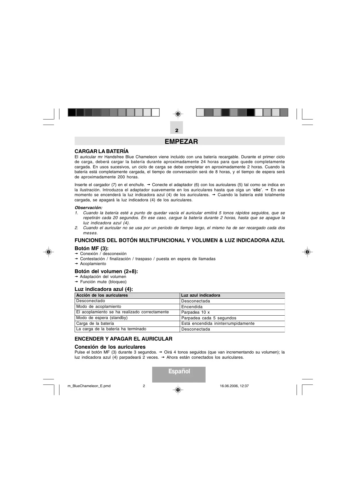 Los nuevo auriculas Blue Chameleon se deben disconectar antes deellar a cabo el procesode acoplamento. Pulse el boton MF (3) hasta que la luz indicadora azul (4) este encendida sin parpadear. Ahora los auriculas estan preparados para el acoplamento. Comience el procesode acoplamento entre su Telefono movil y los auriculas Blue Chameleon. (Consulte el manual de instrucciones de su Telefono movil). SeLECTION Blue Ch-I de la lista de aparatos acoplados de su Telefono movil. Si el Telefono movil le pide su numero PIN, introduzca 0000 y confirmre. Cuando el procesode acoplamento haya conclusido, la luz indicadora azul (4) de los auriculas parpadera 10 vetcs.