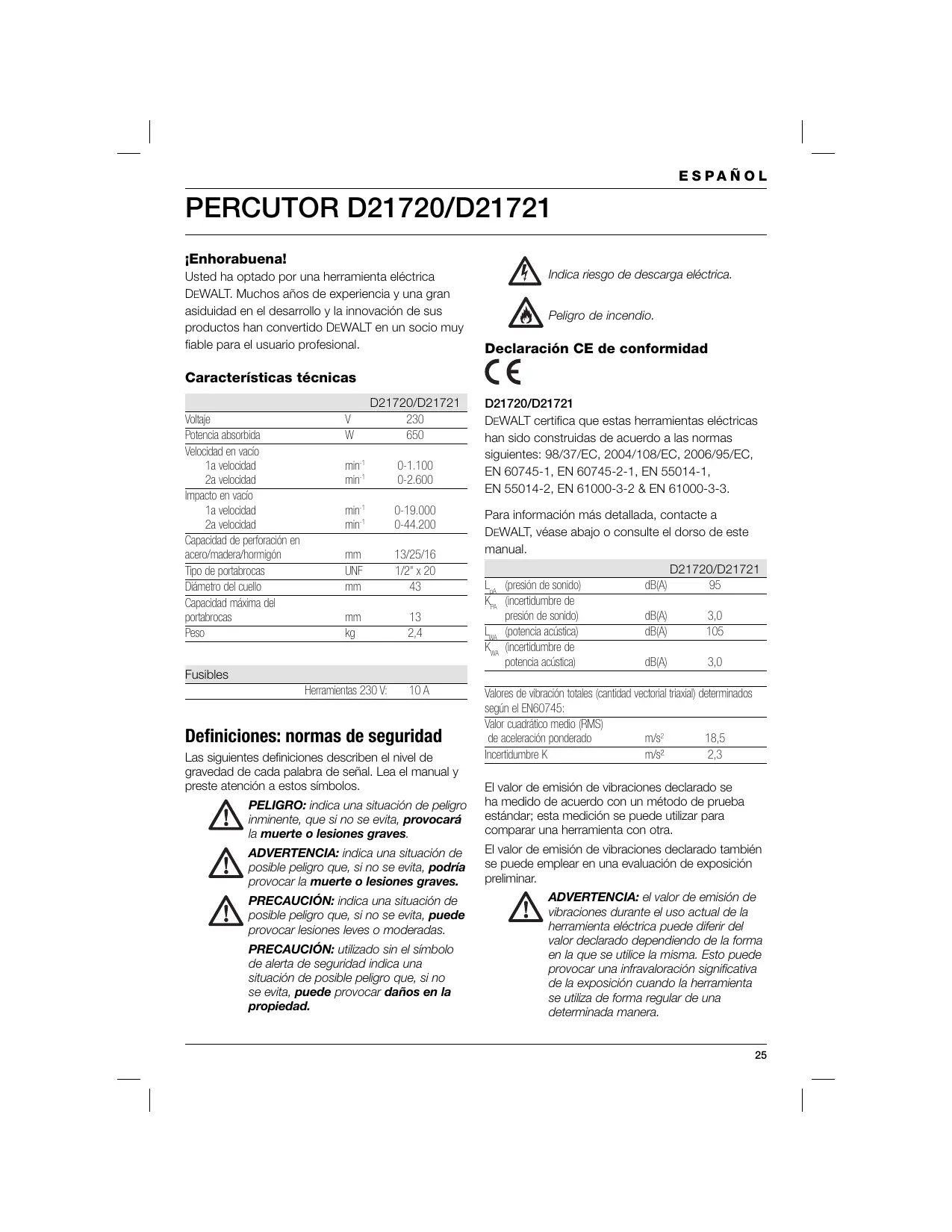¡Enhorabuena! Usted ha optado por una herramienta eléctrica DEWALT. Muchos años de experiencia y una gran asiduidad en el desarrollo y la innovación de sus productos han convertido DEWALT en un socio muy fiable para el usuario profesional. Indica riesgo de descarga eléctrica. Peligro de incendio. Declaración CE de conformidad Características técnicas Voltaje Potencia absorbida Velocidad en vacío 1a velocidad 2a velocidad Impacto en vacío 1a velocidad 2a velocidad Capacidad de perforación en acero/madera/hormigón Tipo de portabrocas Diámetro del cuello Capacidad máxima del portabrocas Peso