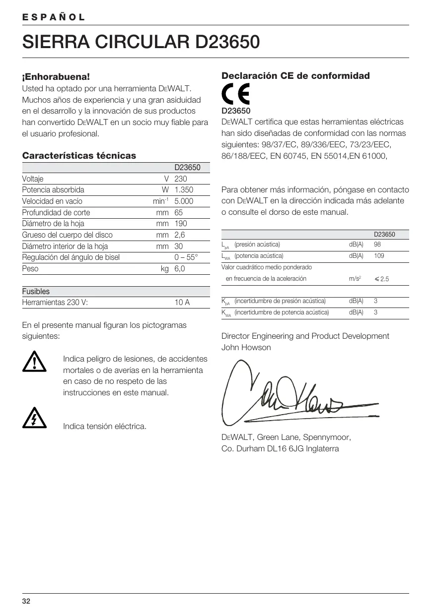 Director Engineering and Product Development John Howson Indica peligro de lesiones, de accidentes mortales o de averías en la herramienta en caso de no respeto de las instrucciones en este manual. Indica tensión eléctrica. DEWALT, Green Lane, Spennymoor, Co. Durham DL16 6JG Inglaterra