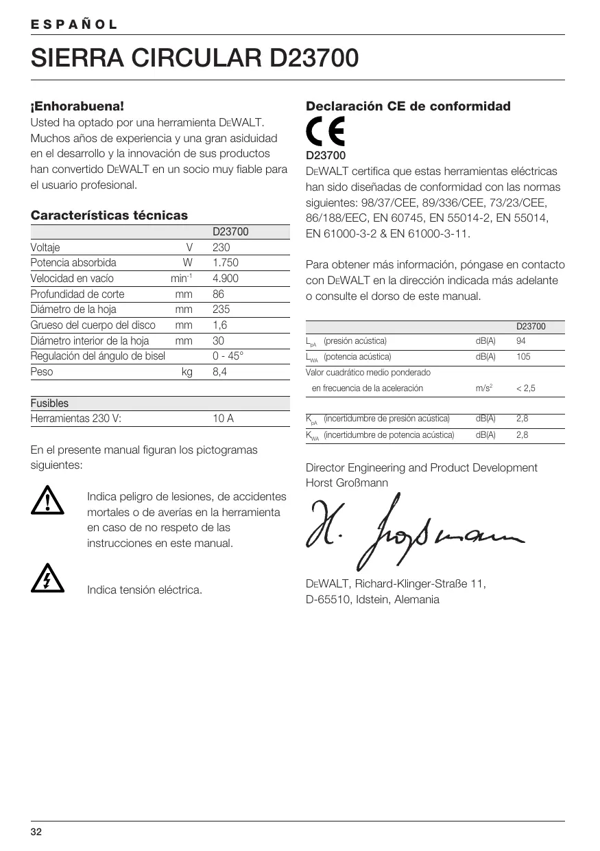 m/s2 < 2,5 KpA (incertidumbre de presión acústica) dB(A) 2,8 KWA (incertidumbre de potencia acústica) dB(A) 2,8 Valor cuadrático medio ponderado en frecuencia de la aceleración Fusibles Herramientas 230 V: 10 A En el presente manual figuran los pictogramas siguientes: Director Engineering and Product Development Horst Großmann Indica peligro de lesiones, de accidentes mortales o de averías en la herramienta en caso de no respeto de las instrucciones en este manual. Indica tensión eléctrica.