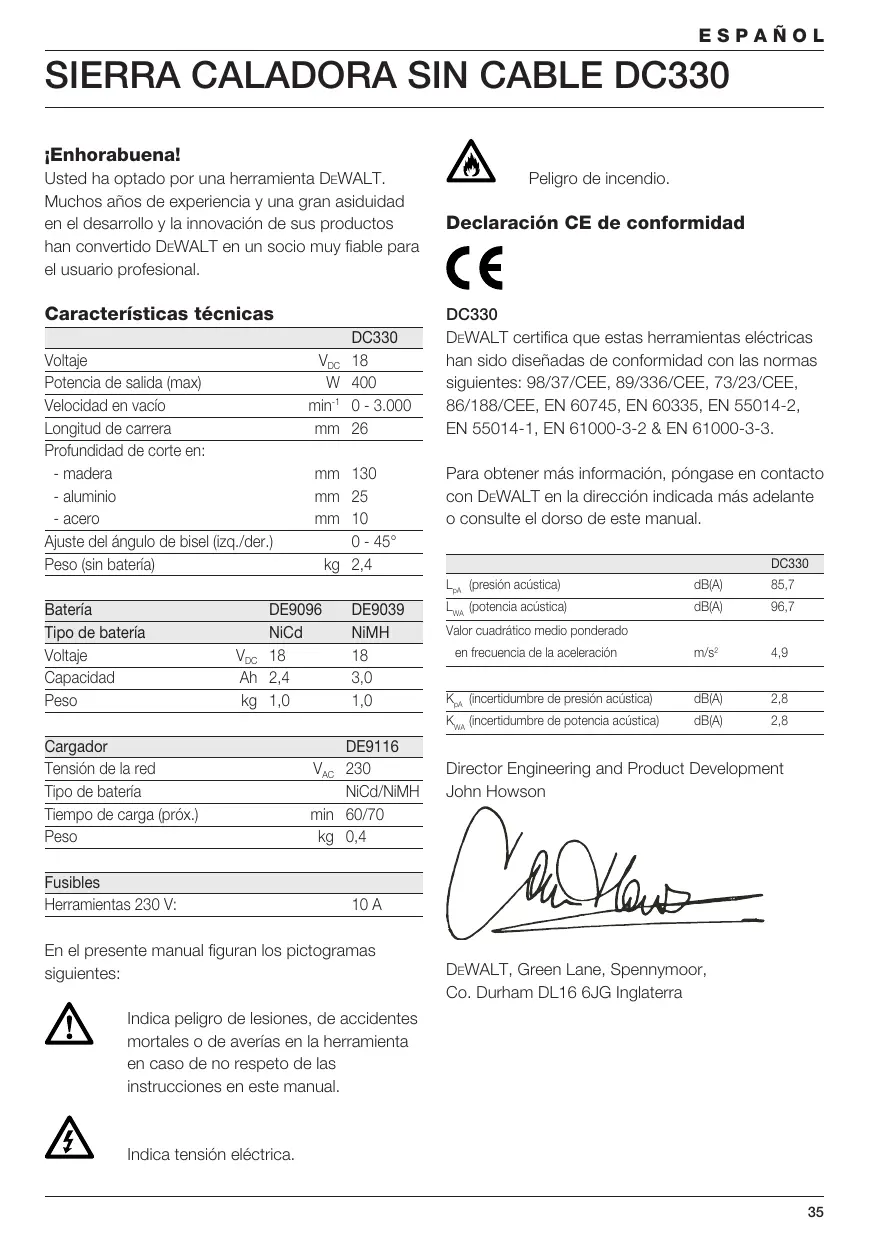 kg 2,4 DE9096 NiCd VDC 18 Ah 2,4 kg 1,0 Cargador Tensión de la red Tipo de batería Tiempo de carga (próx.) Peso Fusibles Herramientas 230 V: DE9039 NiMH 3,0 1,0 DE9116 VAC 230 NiCd/NiMH min 60/70 kg 0,4 Peligro de incendio. Declaración CE de conformidad DC330 DEWALT certifica que estas herramientas eléctricas han sido diseñadas de conformidad con las normas siguientes: 98/37/CEE, 89/336/CEE, 73/23/CEE, 86/188/CEE, EN 60745, EN 60335, EN 55014-2, EN 55014-1, EN 61000-3-2 & EN 61000-3-3. Para obtener más información, póngase en contacto con DEWALT en la dirección indicada más adelante o consulte el dorso de este manual. DC330 LpA (presión acústica) dB(A) 85,7 LWA (potencia acústica) dB(A) 96,7 m/s2 4,9 KpA (incertidumbre de presión acústica) dB(A) 2,8 KWA (incertidumbre de potencia acústica) dB(A) 2,8 Valor cuadrático medio ponderado en frecuencia de la aceleración Director Engineering and Product Development John Howson 10 A En el presente manual figuran los pictogramas siguientes: DEWALT, Green Lane, Spennymoor, Co. Durham DL16 6JG Inglaterra Indica peligro de lesiones, de accidentes mortales o de averías en la herramienta en caso de no respeto de las instrucciones en este manual. Indica tensión eléctrica.