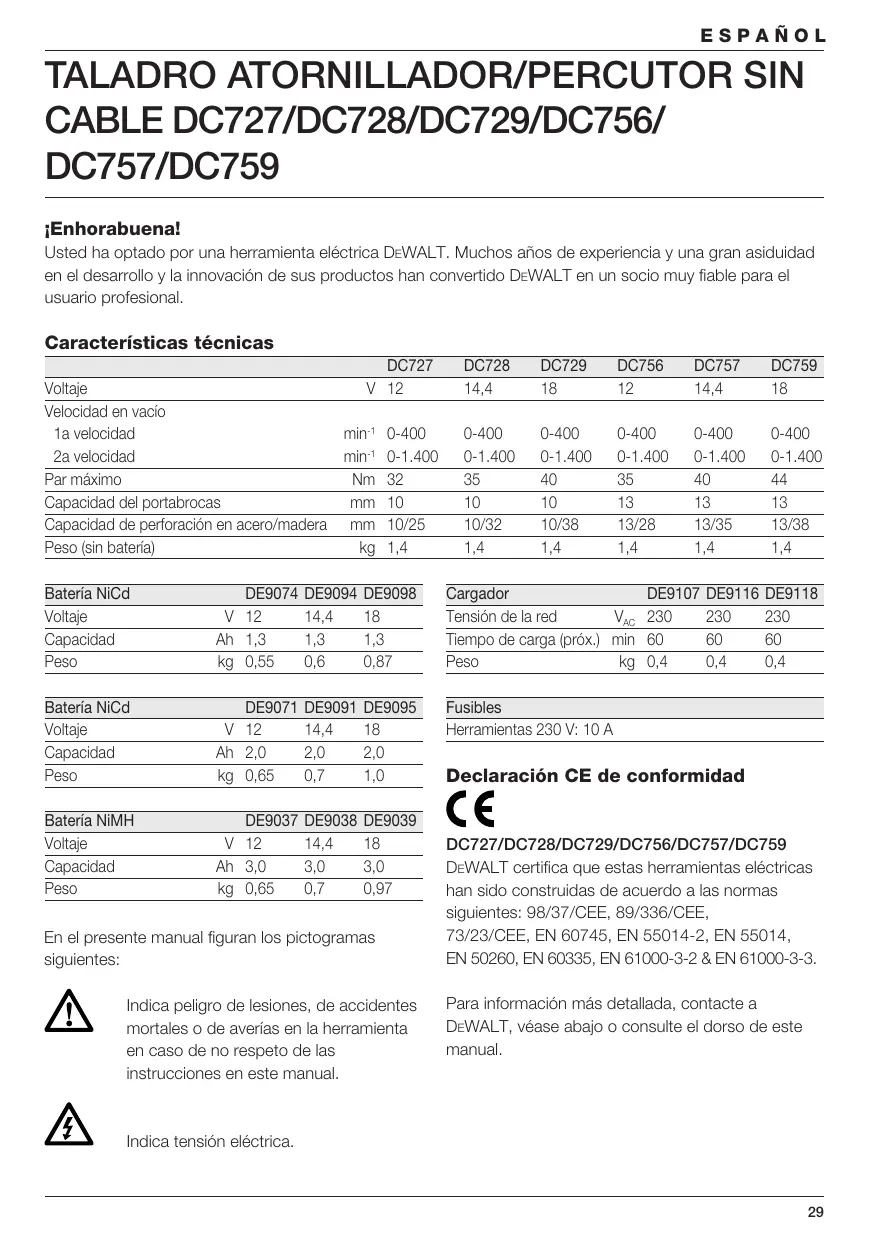0,4 Declaración CE de conformidad DC727/DC728/DC729/DC756/DC757/DC759 DEWALT certifica que estas herramientas eléctricas han sido construidas de acuerdo a las normas siguientes: 98/37/CEE, 89/336/CEE, 73/23/CEE, EN 60745, EN 55014-2, EN 55014, EN 50260, EN 60335, EN 61000-3-2 & EN 61000-3-3. Para información más detallada, contacte a DEWALT, véase abajo o consulte el dorso de este manual. Indica tensión eléctrica.